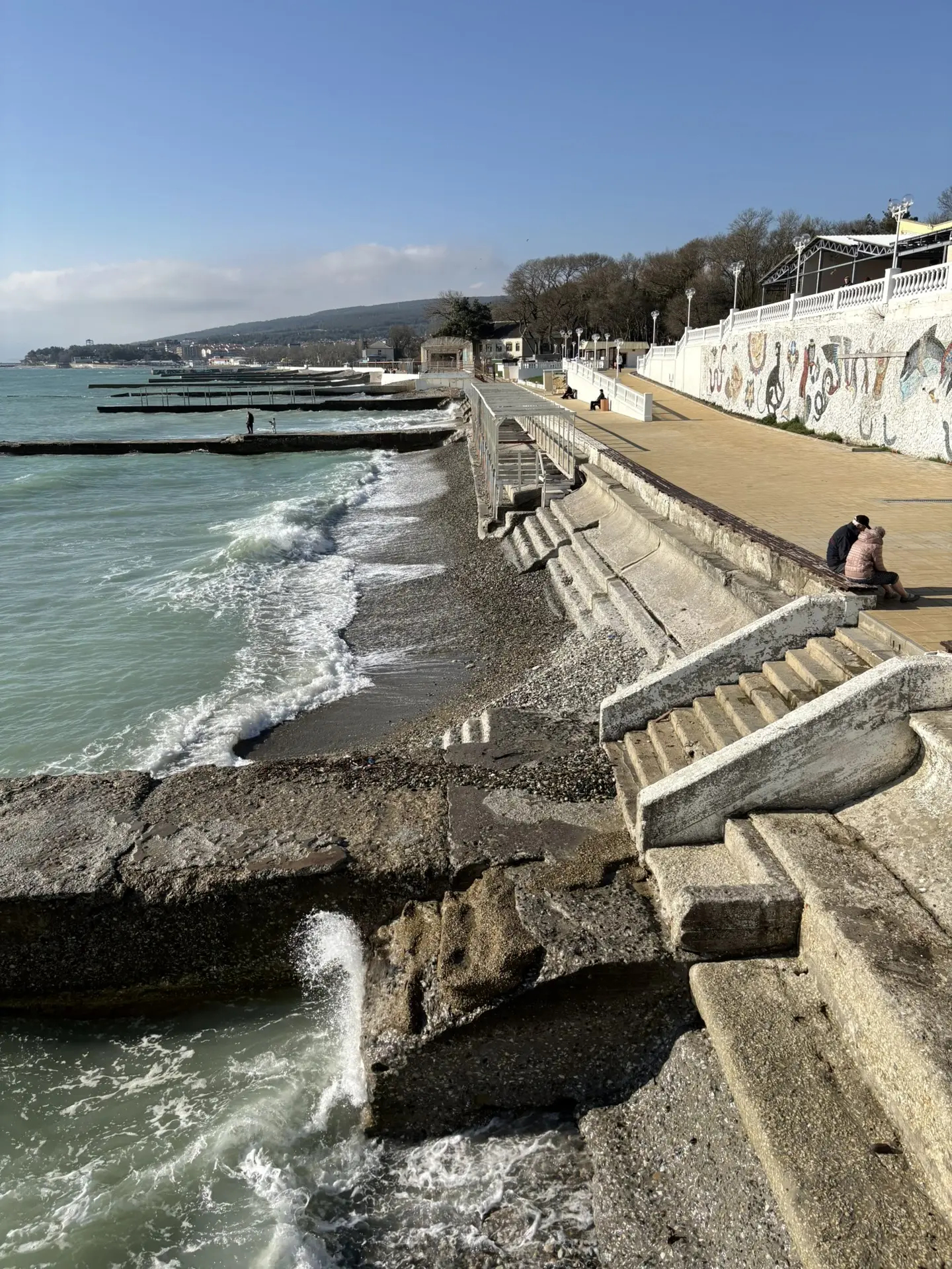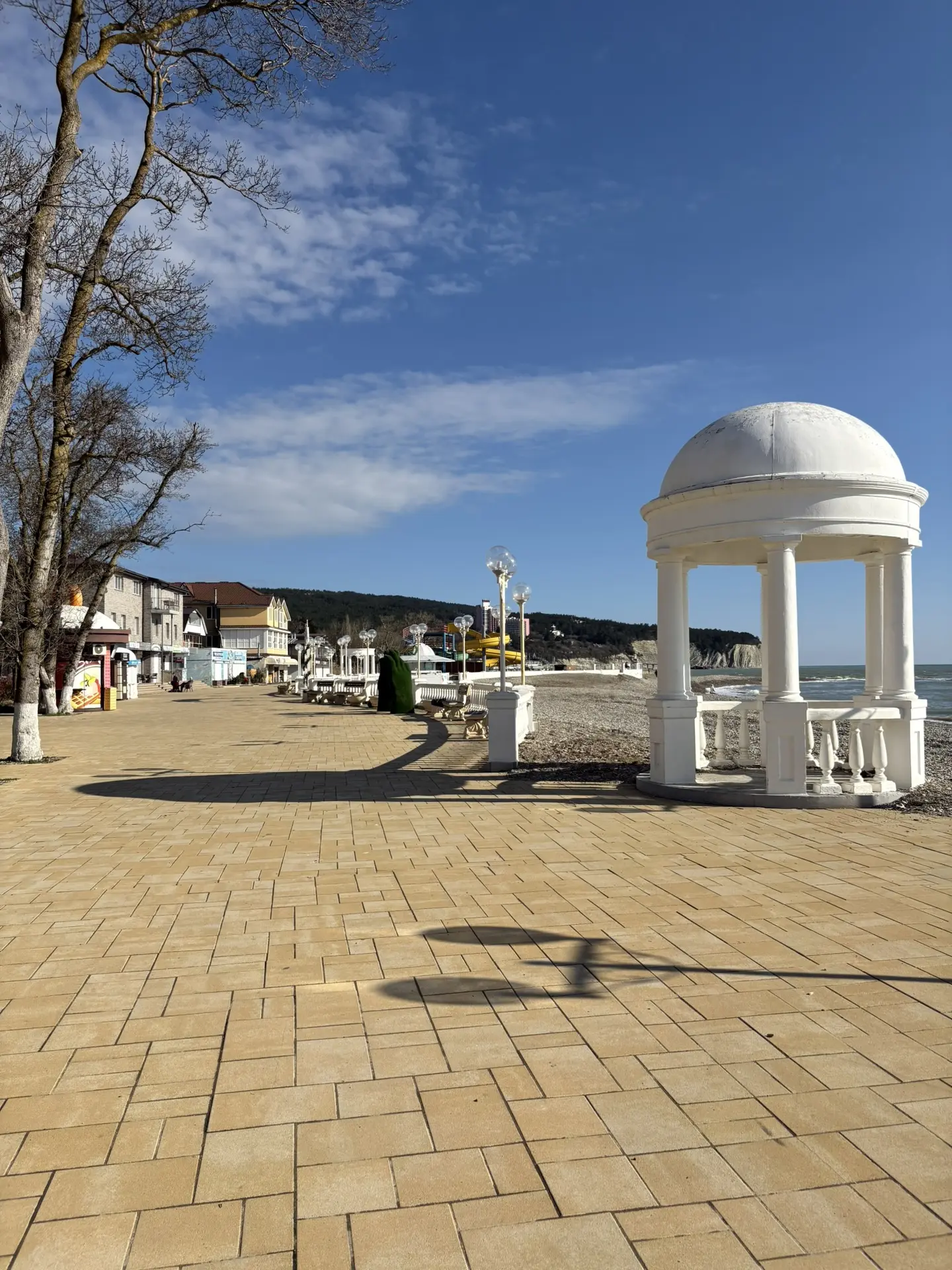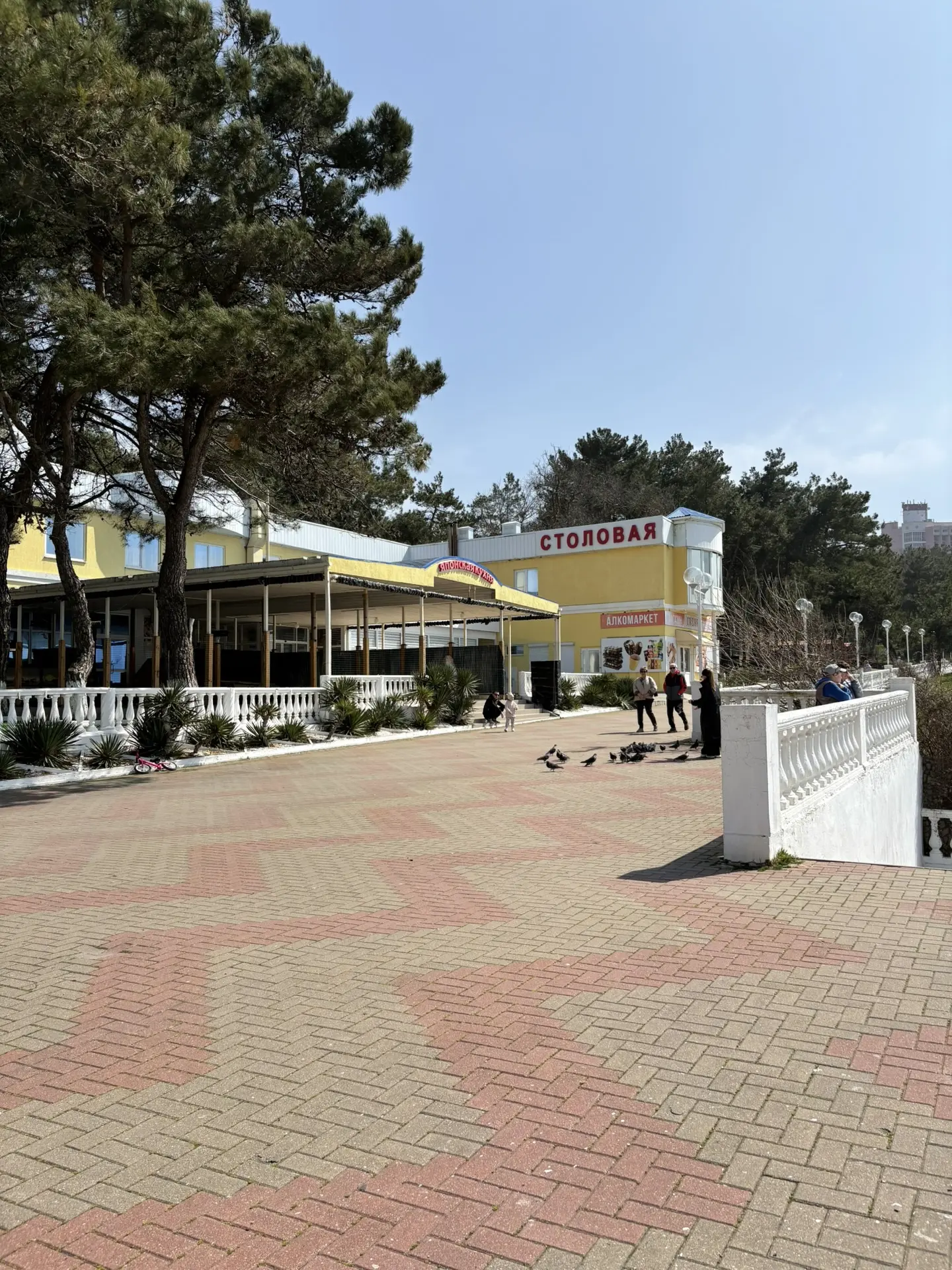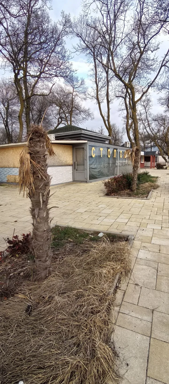 Набережная после субботника - бывшие прекрасными, но засохшие пальмы, "красивая" сухая трава, и на ней 💩
