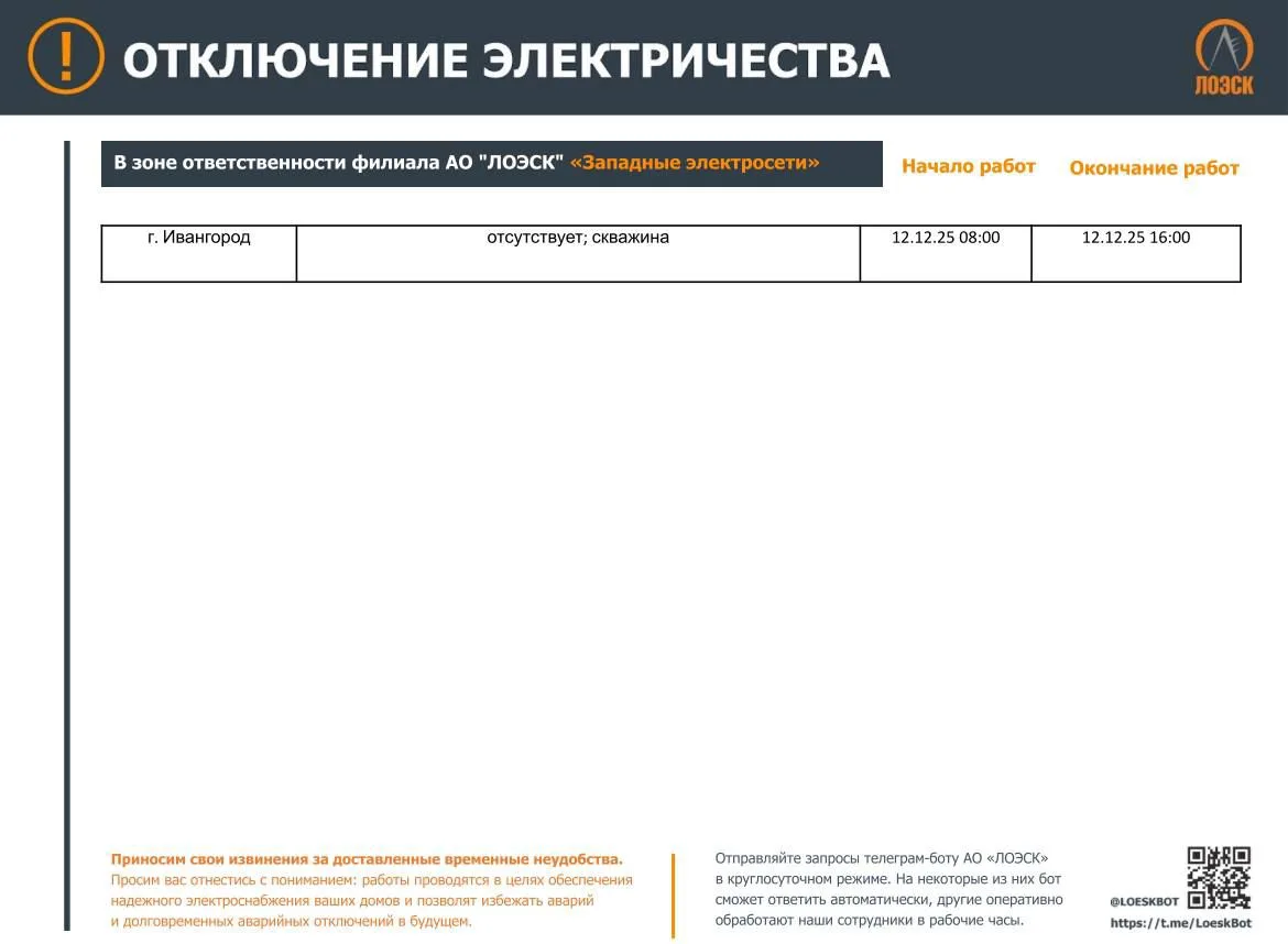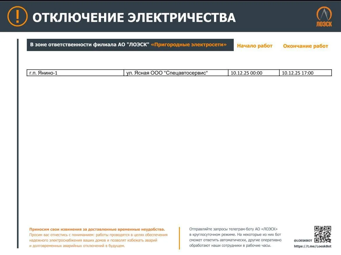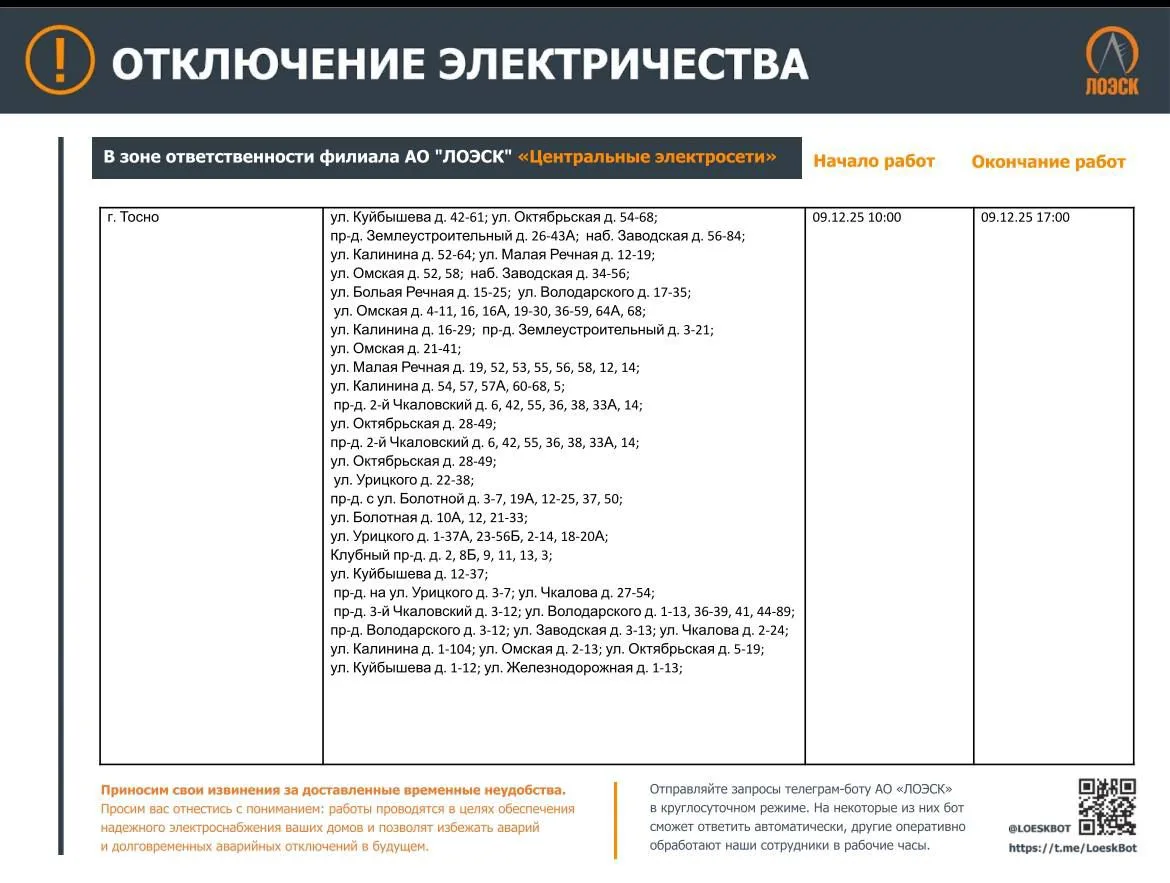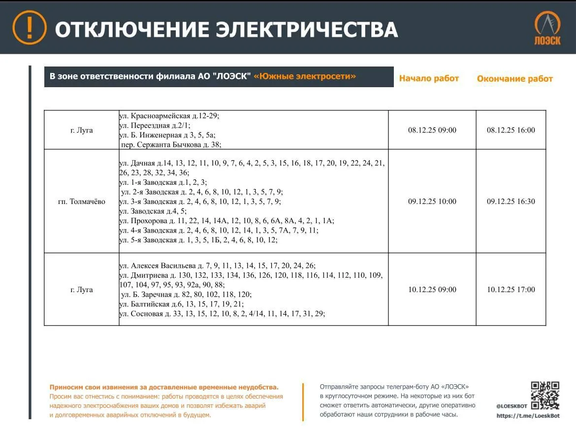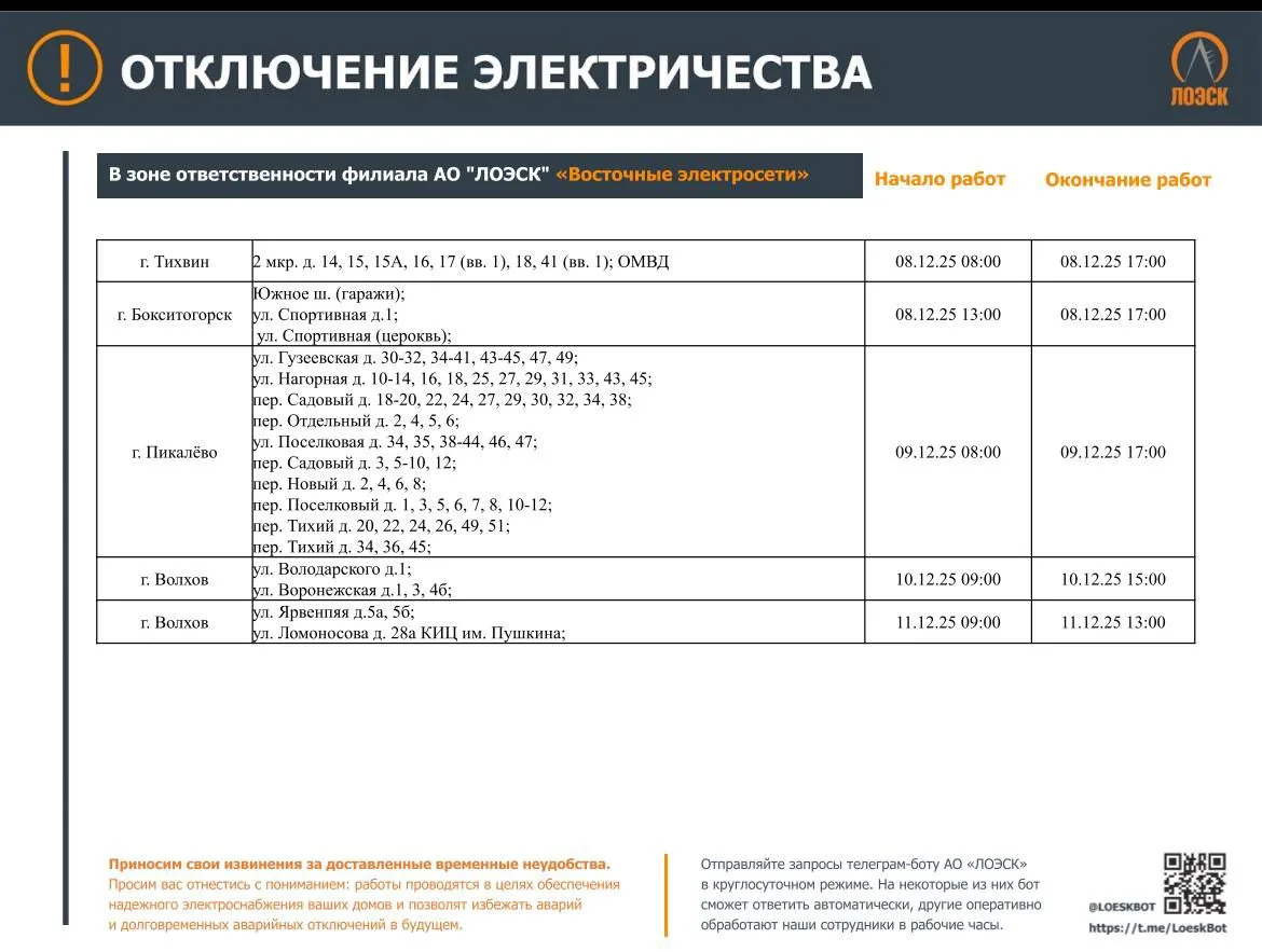 💡 График плановых отключений электричества в Ленобласти с 8 по 14 декабря.