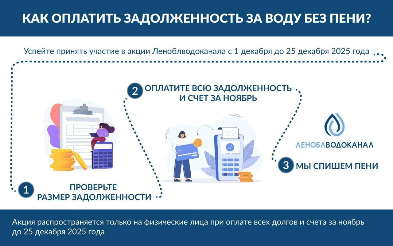 Для участия в акции необходимо оплатить всю имеющуюся задолженность за услуги Леноблводоканала, а также внести платёж за ноябрь 2025 года. Сделать это нужно до 25 декабря 2025 года — и организация спишет все начисленные пени.