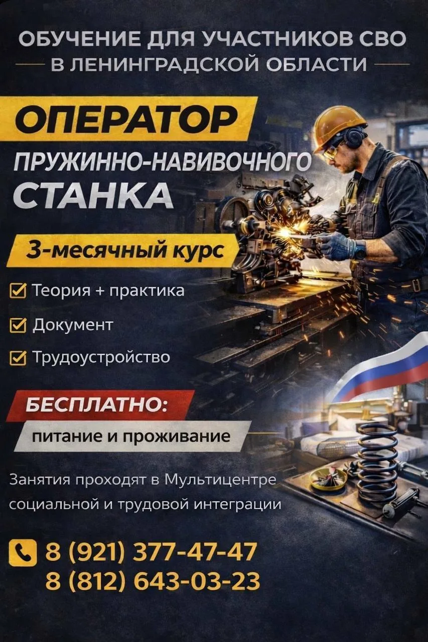 С 16 марта в Ленинградской области стартует трёхмесячное обучение для участников СВО по специальности «Оператор пружинно-навивочного станка». Курс организован Кластером комплексного сопровождения и реабилитации совместно с Обуховским пружинным заводом. Предусмотрены практика на производстве, документ об окончании, возможное трудоустройство, а также бесплатные питание и проживание. Запись: 8 (921) 377-47-47, 8 (812) 643-03-23.