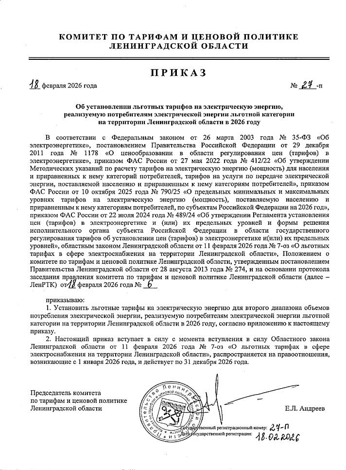 В Ленинградской области принят областной закон о льготном тарифе на электроэнергию для отдельных категорий потребителей на 2026 год. Закон подписал глава 47 региона, документ опубликован и вступит в силу через 10 дней после публикации. Он распространяется на правоотношения с 1 января 2026 года и действует до 31 декабря 2026 года.