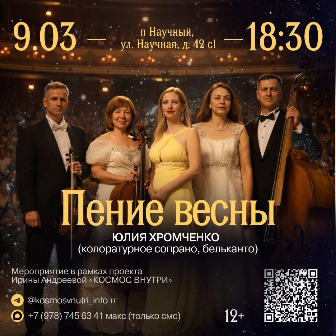 Премьера нового формата концертов проекта по возрождению культурных традиций в России «КОСМОС ВНУТРИ» Ирины Андреевой — концерты в кинотеатре, открытие состоится 17 октября в старейшем кинотеатре Симферополя, которому уже более 120 лет!