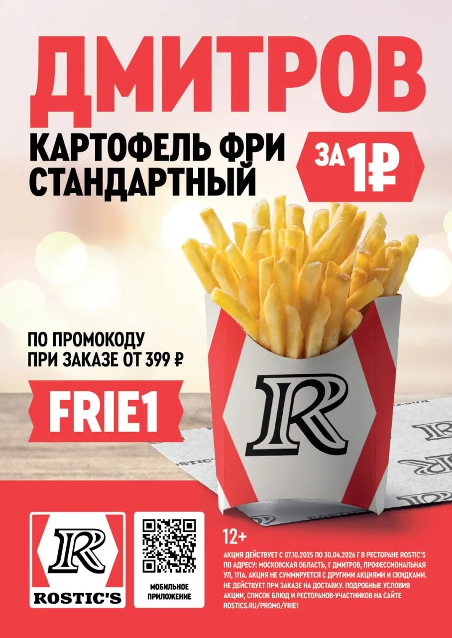 До 30 апреля 2026 года оформляй заказ навынос от 399 ₽ в приложении Rostic’s, вводи промокод FRIE1 — и получай картофель фри стандартный за 1₽!