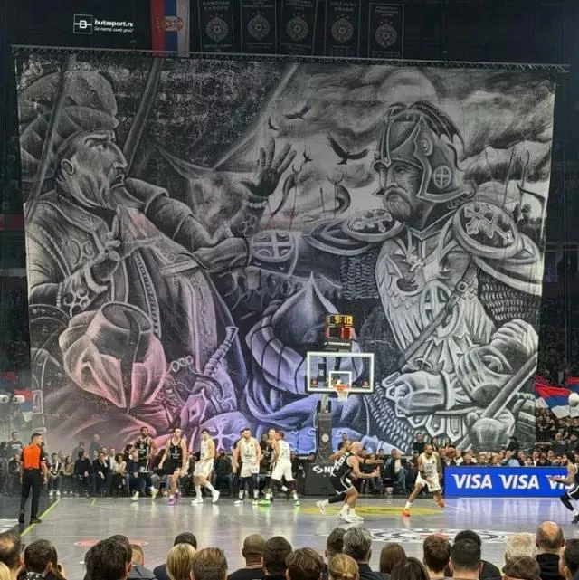 Сербы на баннере изобразили Милоша Обилича, который заколол османского султана I Мурада в битве при Косово в 1389 году.