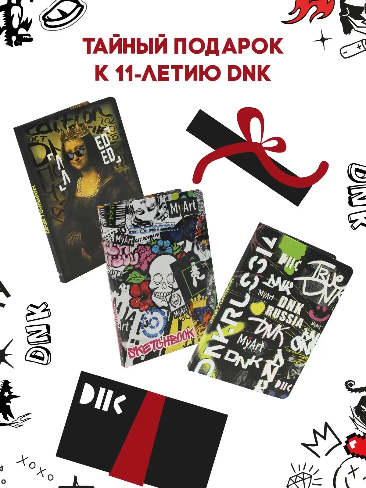 Гарантированно вы получаете именной скетчкук и секретный подарок от DNK (сюрпризом может быть все, что угодно. И для каждого он будет свой в зависимости от выбранного размера)