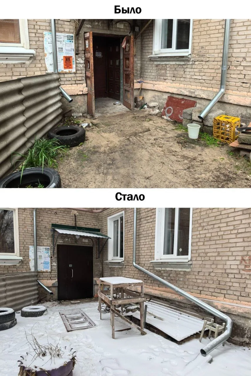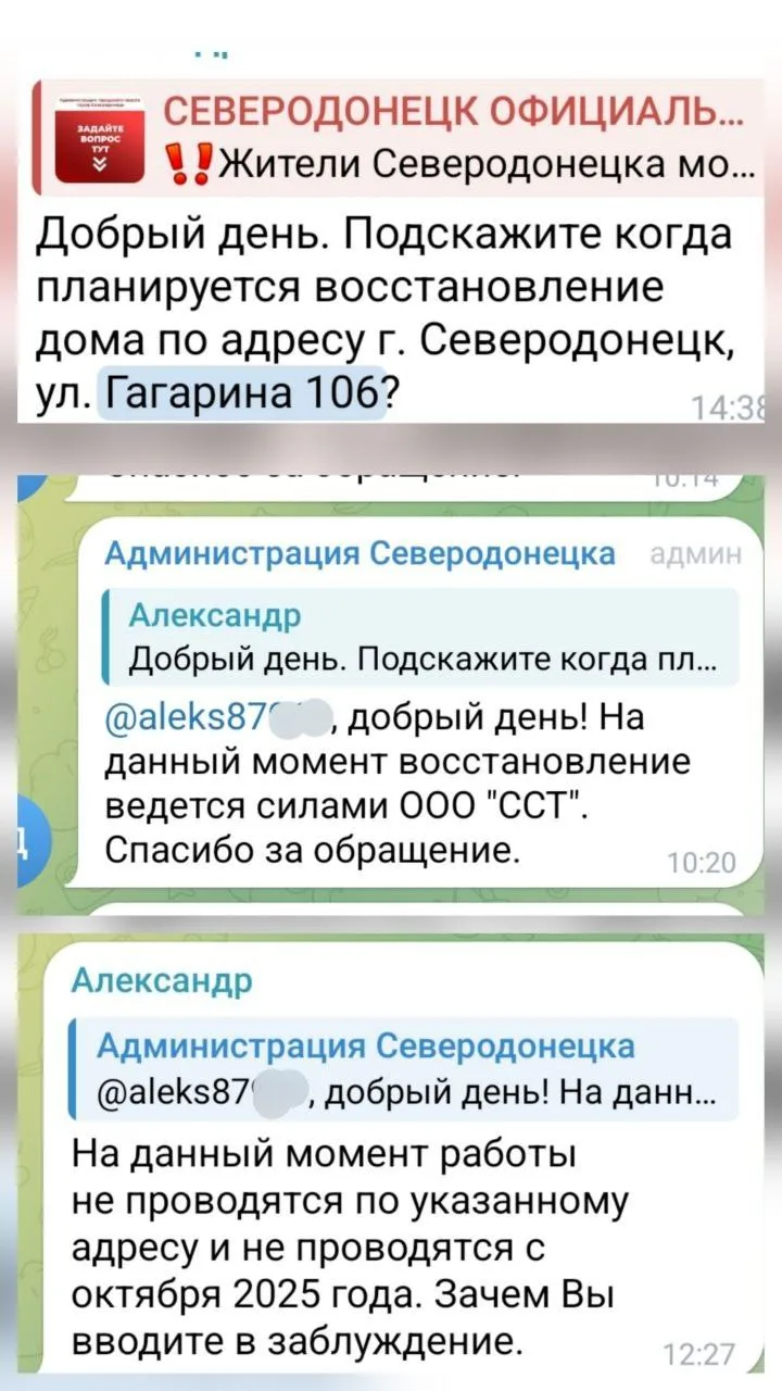 На скриншоте видно, что администрация города заявляет о проведении ремонтных работ, однако житель этого дома утверждает, что работы не ведутся с октября 2025 года.
