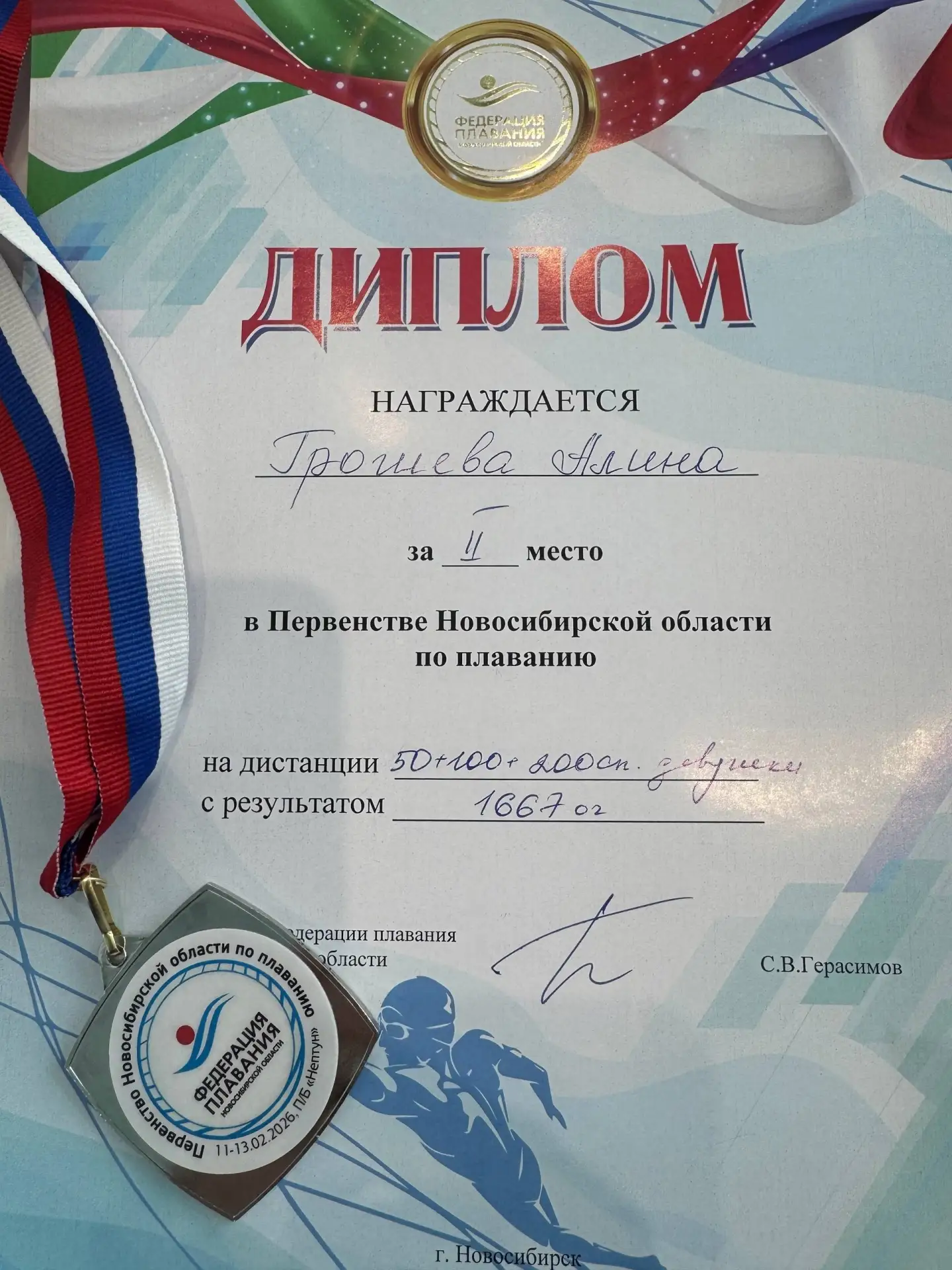 🥈Алина Грошева стала второй (первенство) по сумме дистанций 50+100+200 м на спине.