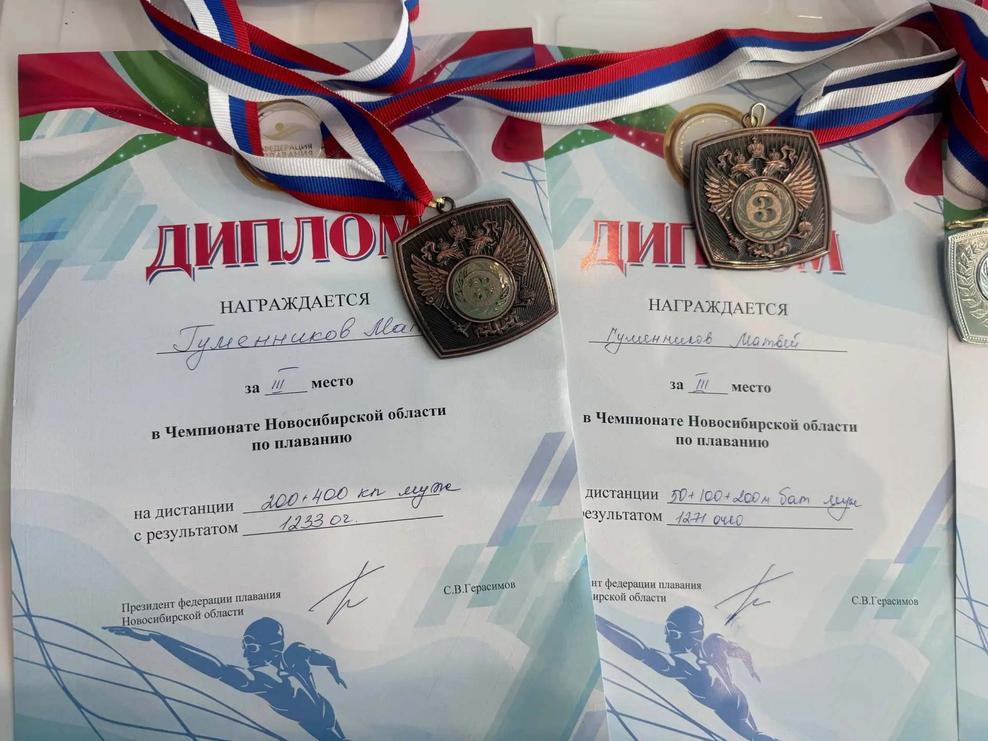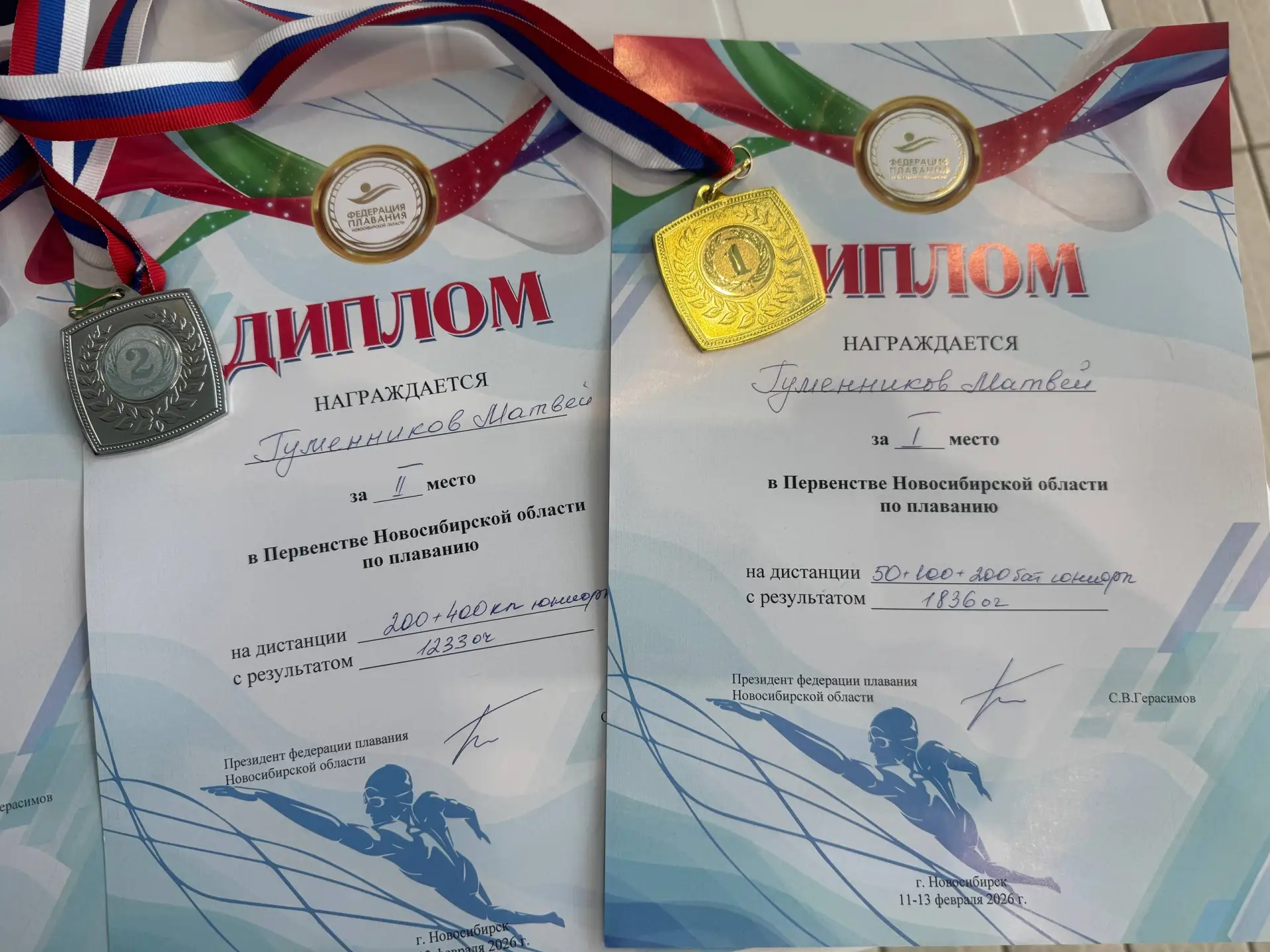 🥇🥈Также Матвей выиграл золотую медаль первенства по сумме дистанций 50+100+200 м баттерфляй и серебряную медаль первенства по сумме дистанций 200+400 комплексное плавание.