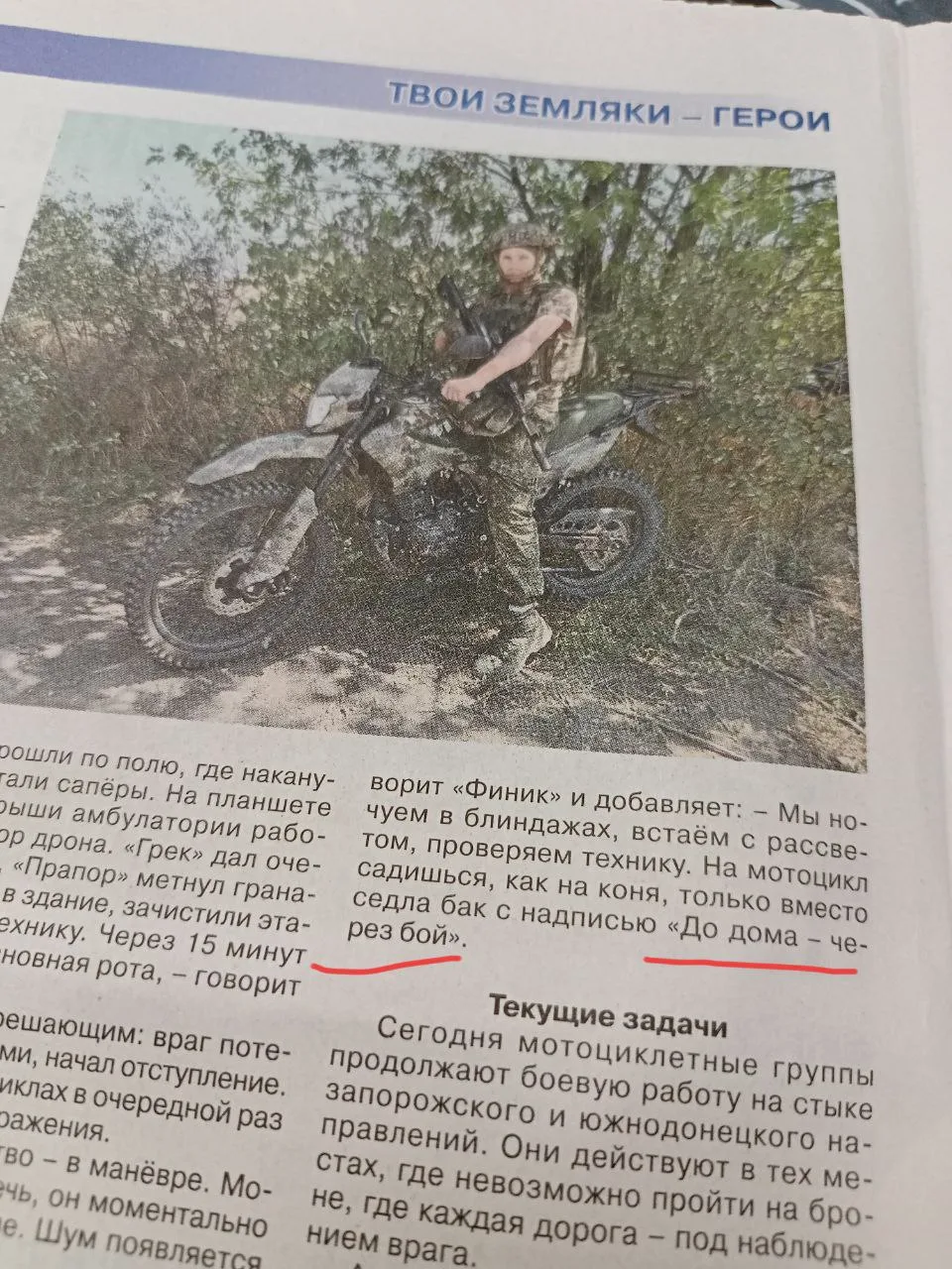 Мой друг Андрей Выползов в газете «Страж Балтики» прочитал репортаж про наших мотоциклистов, воюющих с бандеровцами в Новороссии. На баке у одного из них с позывным Финик выбита надпись: «До дома — через бой». Таким парням посвящается...