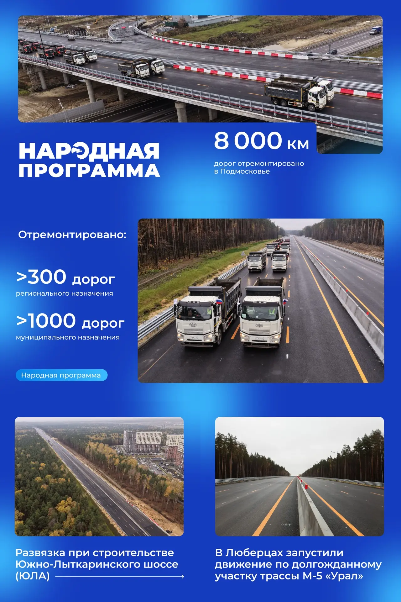 «Развитию транспортной инфраструктуры регионов посвящен целый раздел народной программы. В Подмосковье с 2021 по 2025 годы по наказам жителей построили и реконструировали 47 автомобильных дорог регионального значения, еще восемь — местного»,