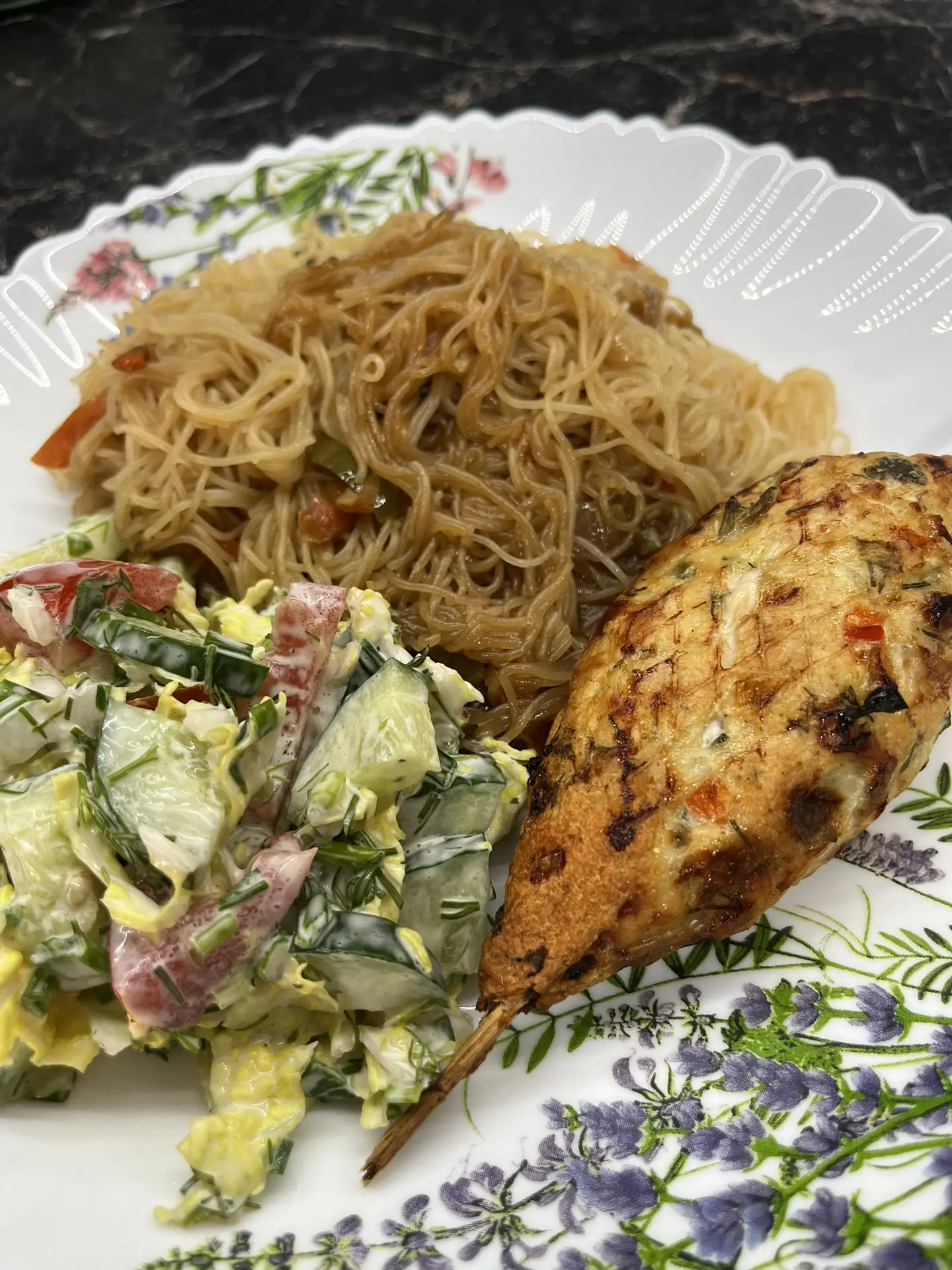 Ужин очень простой, быстрый и вкусный. Куриные люля-кебаб из морозилки(как хорошо когда есть свои заготовки) 👍 фунчоза с овощами, салатик 👌