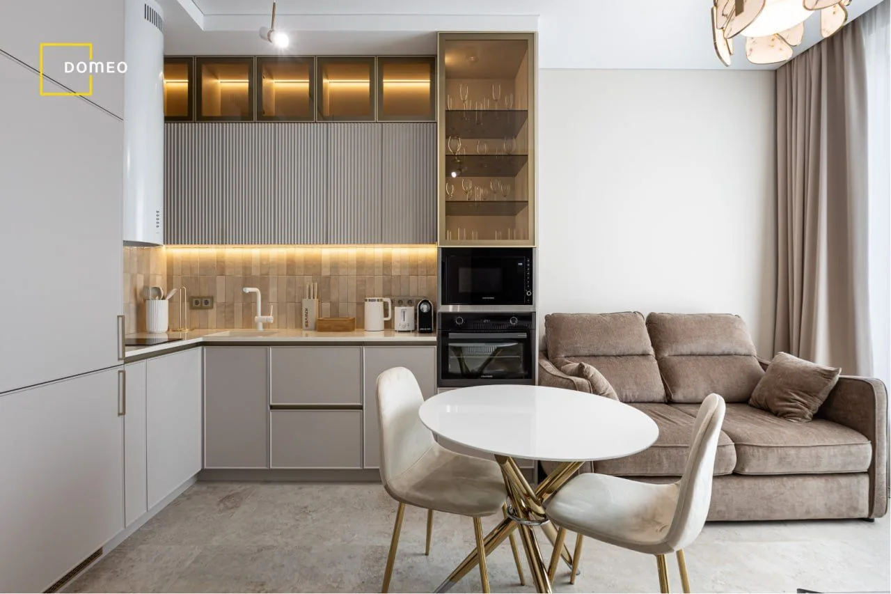 ПРОБЛЕМЫ: мало метража, нужно разделить кухню, гостиную и рабочее место без захламления.