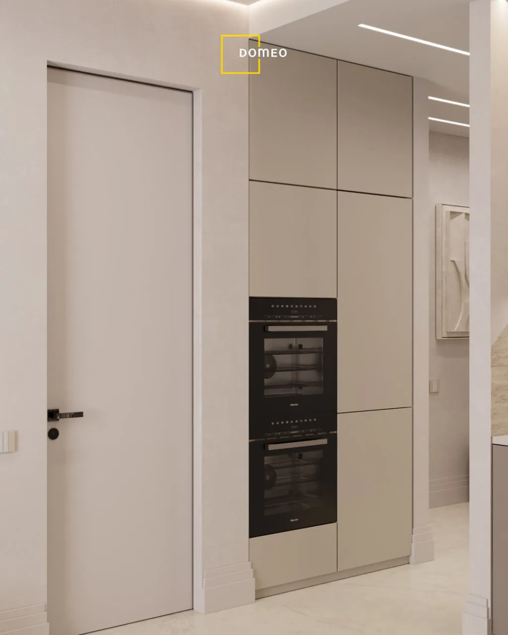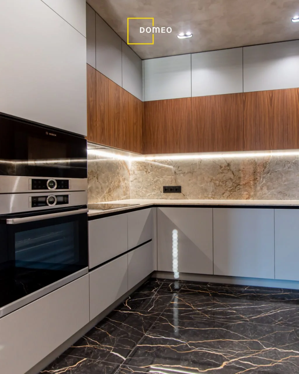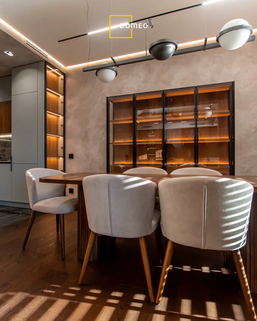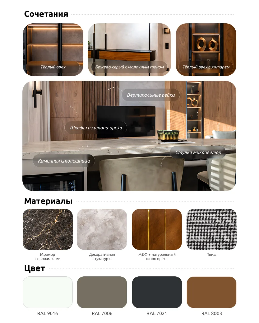 Что сделали? Кухню собрали на сочетании эмали и шпона с тонкой столешницей и встроенными системами хранения. В интерьере использовали декоративную штукатурку, скрытый плинтус, потолочные решения со шпоном и подсветкой — пространство выглядит цельным и дорогим.