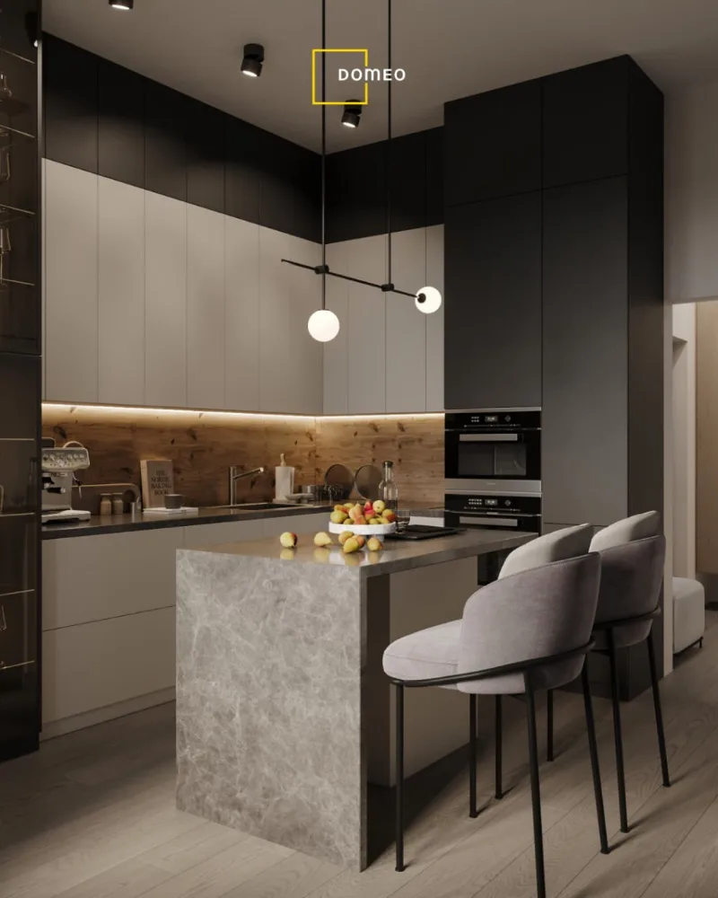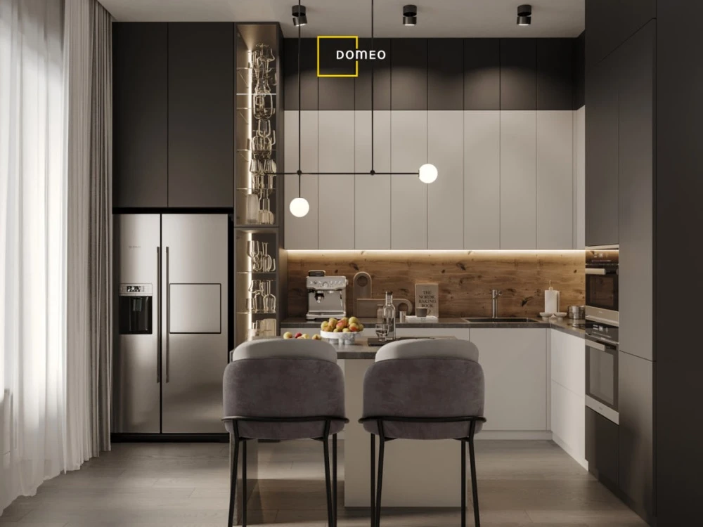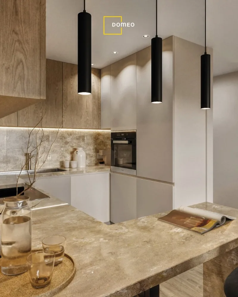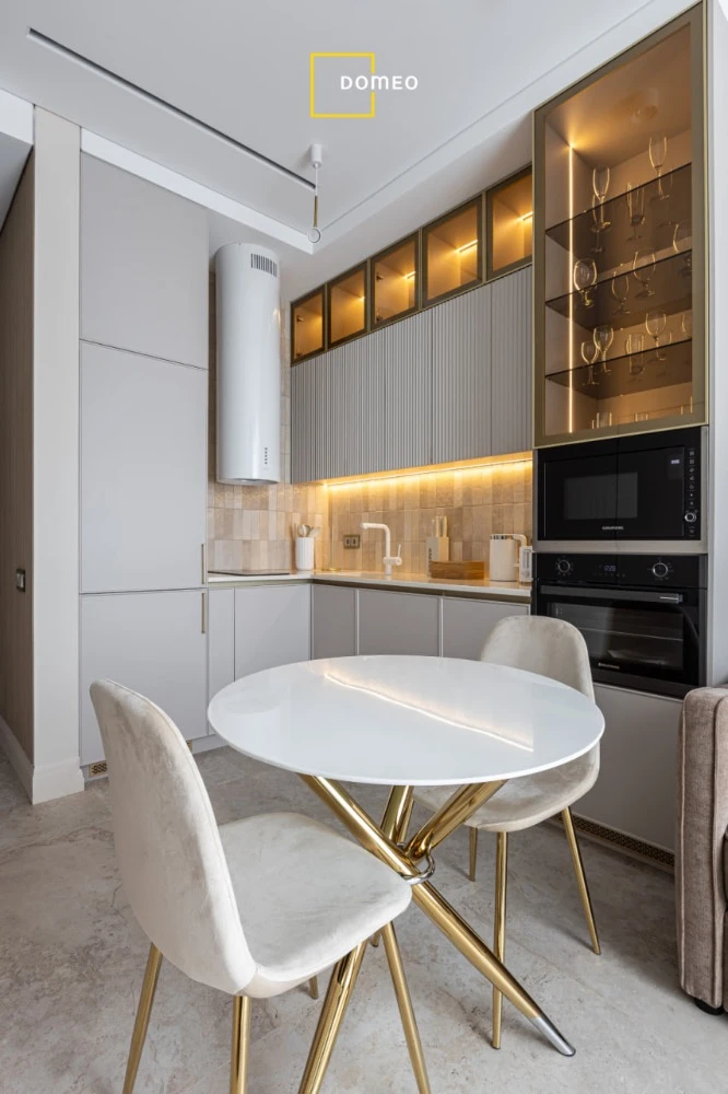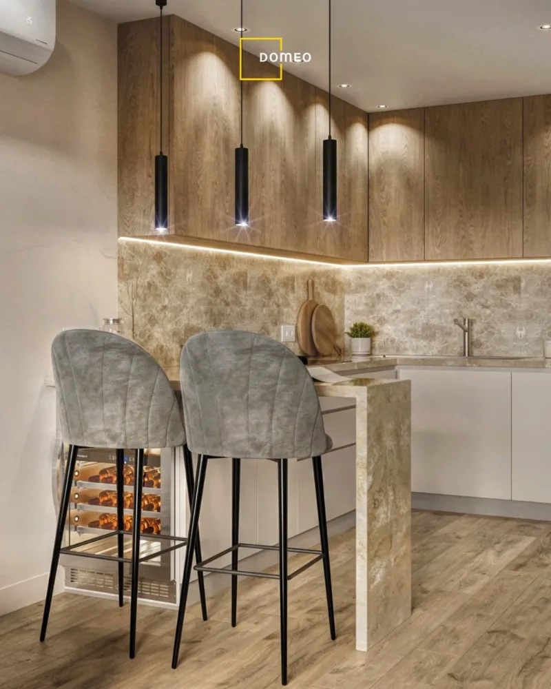 Что сделали? Кухню собрали на сочетании эмали и шпона с тонкой столешницей и встроенными системами хранения. В интерьере использовали декоративную штукатурку, скрытый плинтус, потолочные решения со шпоном и подсветкой — пространство выглядит цельным и дорогим.