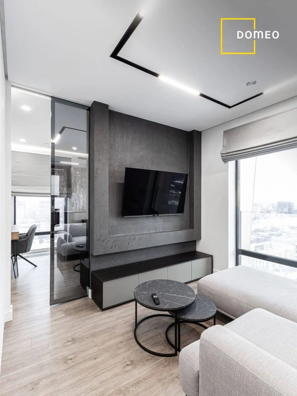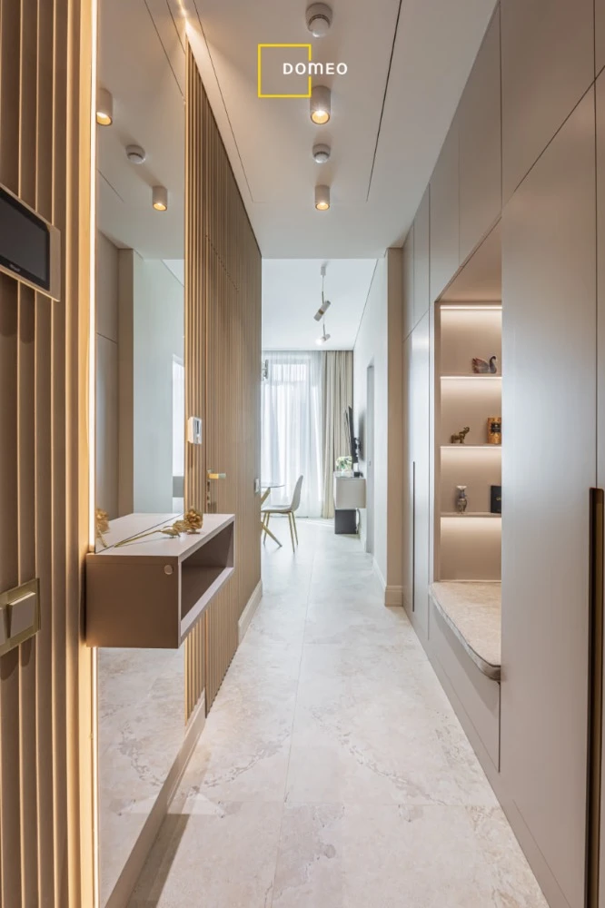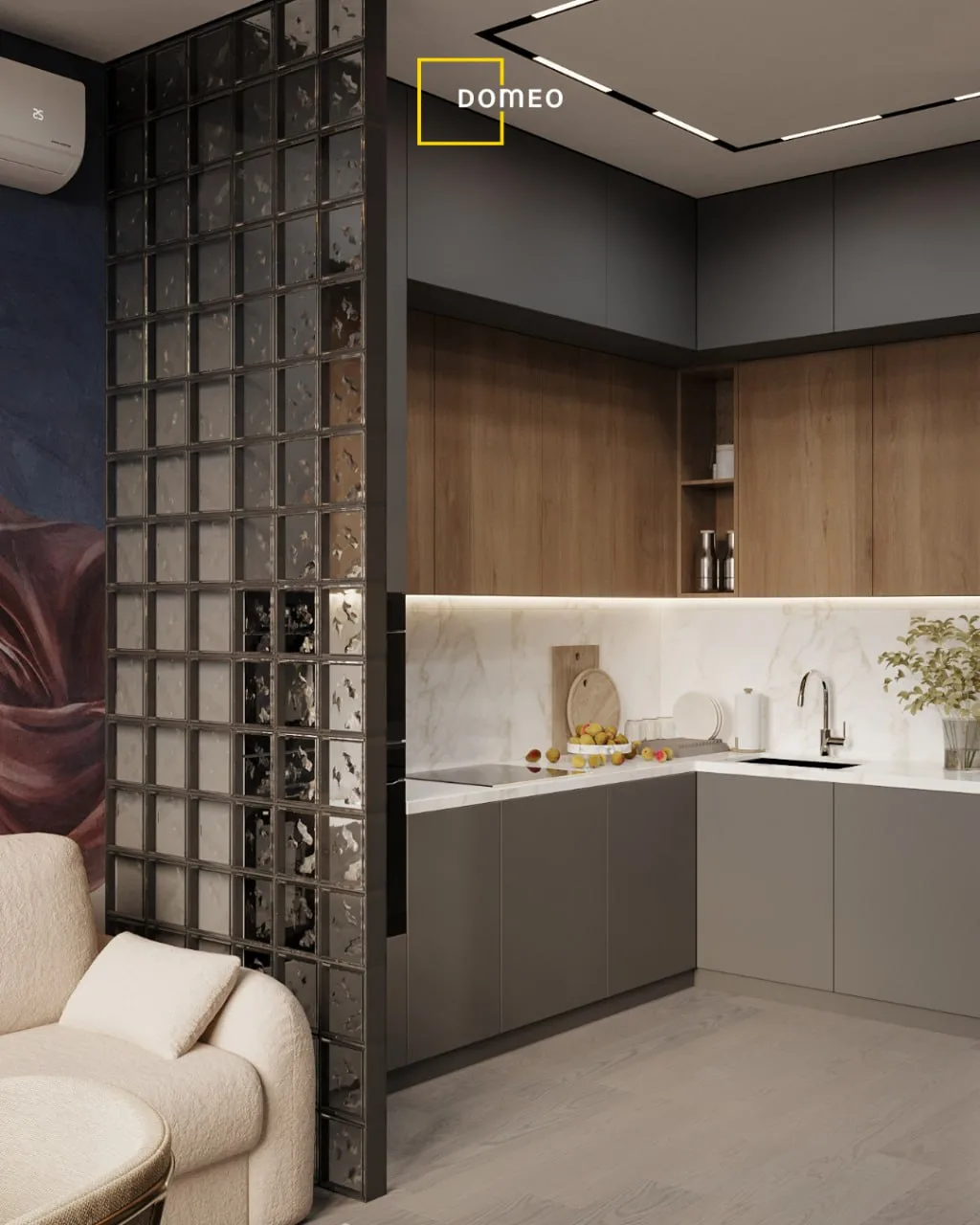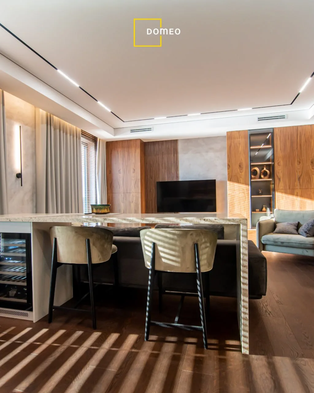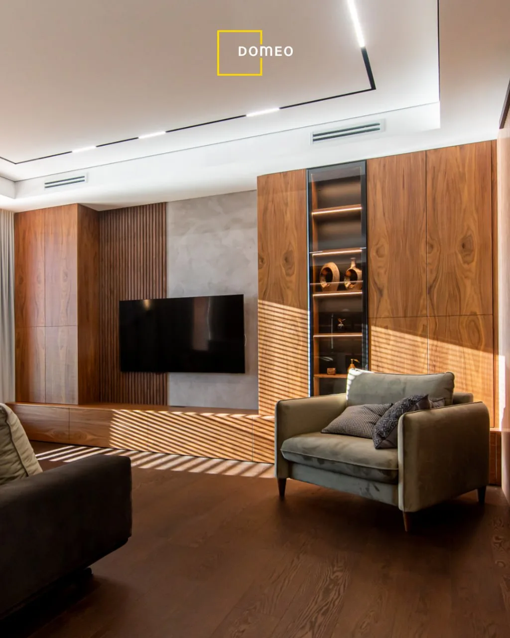 Как сэкономили? Часть мебели выполнили на локальном производстве вместо импорта, использовали экошпон, оптимизировали перегородки и встроенные решения. Это позволило сохранить эффект премиального интерьера без переплаты за бренд.