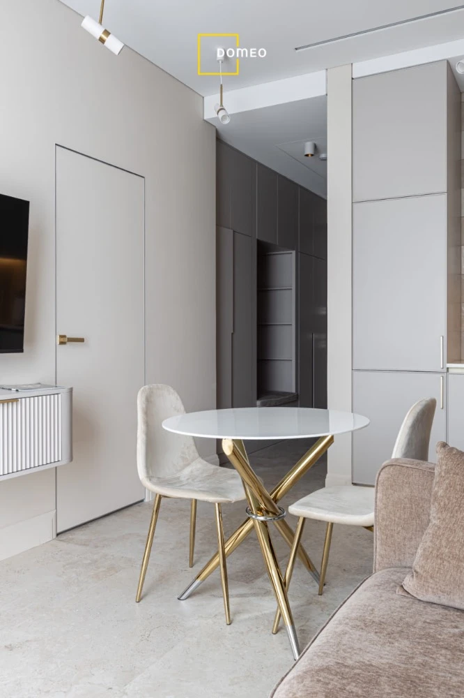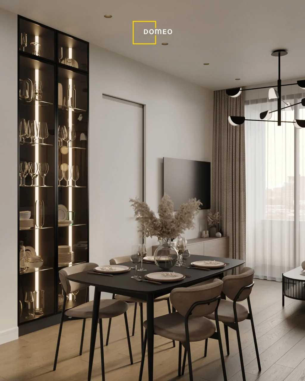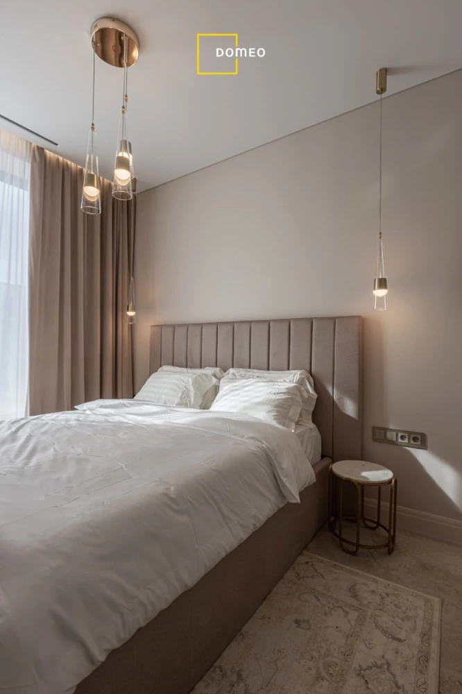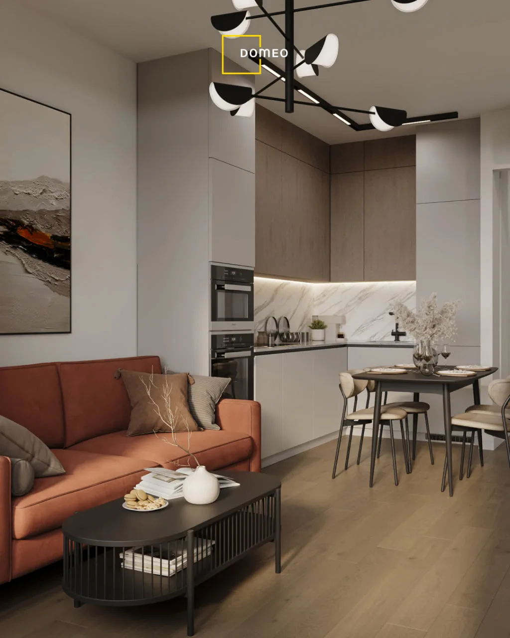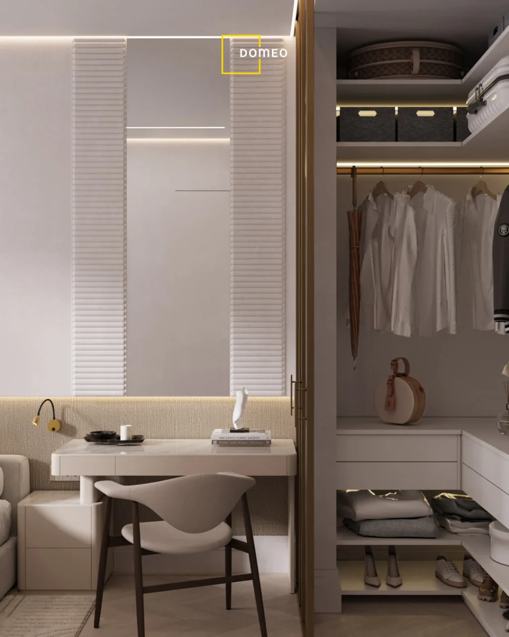Как сэкономили? Часть мебели выполнили на локальном производстве вместо импорта, использовали экошпон, оптимизировали перегородки и встроенные решения. Это позволило сохранить эффект премиального интерьера без переплаты за бренд.