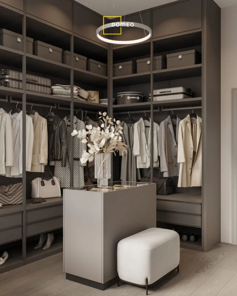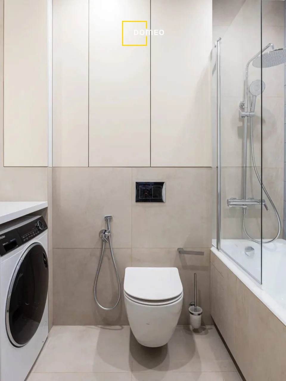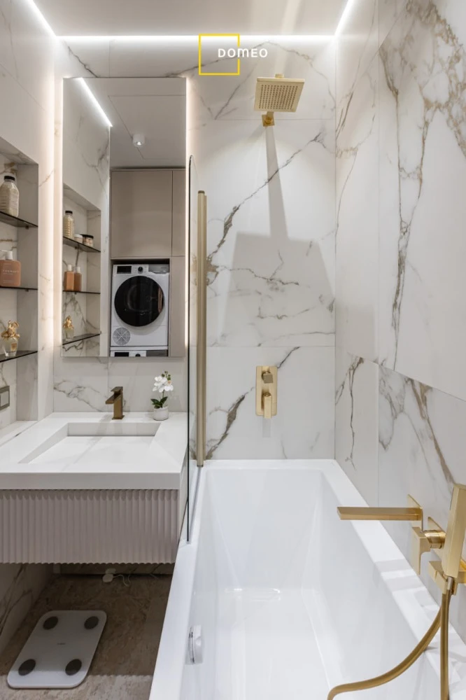 Как решили проблемы? Отдельная постирочная для порядка, гардеробные вместо громоздких шкафов и встроенные системы хранения. В ванных предусмотрели двойную раковину, ниши и скрытые корзины для белья. В итоге квартира выглядит легкой, но работает на повседневный комфорт семьи.
