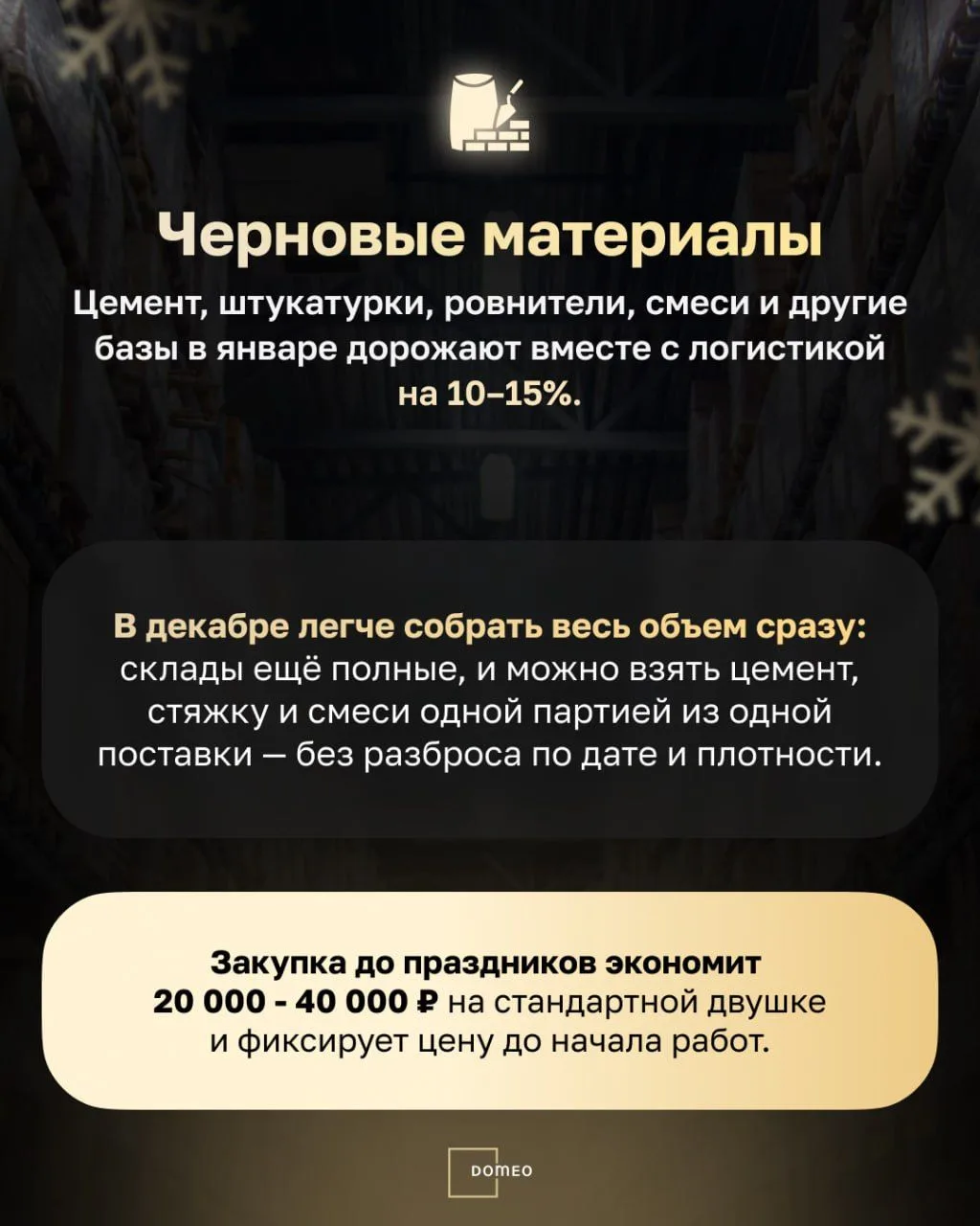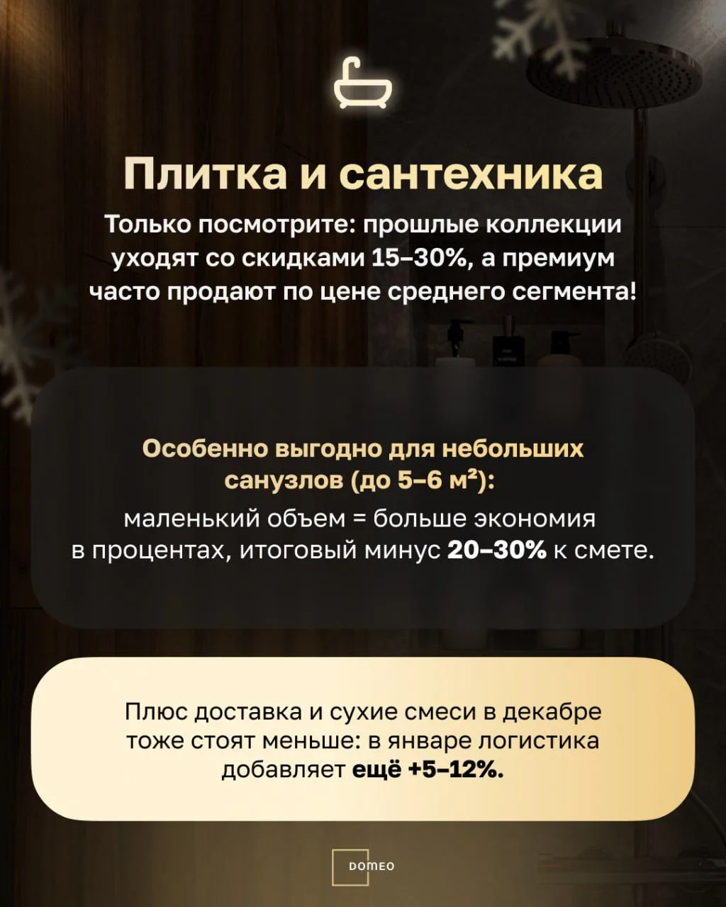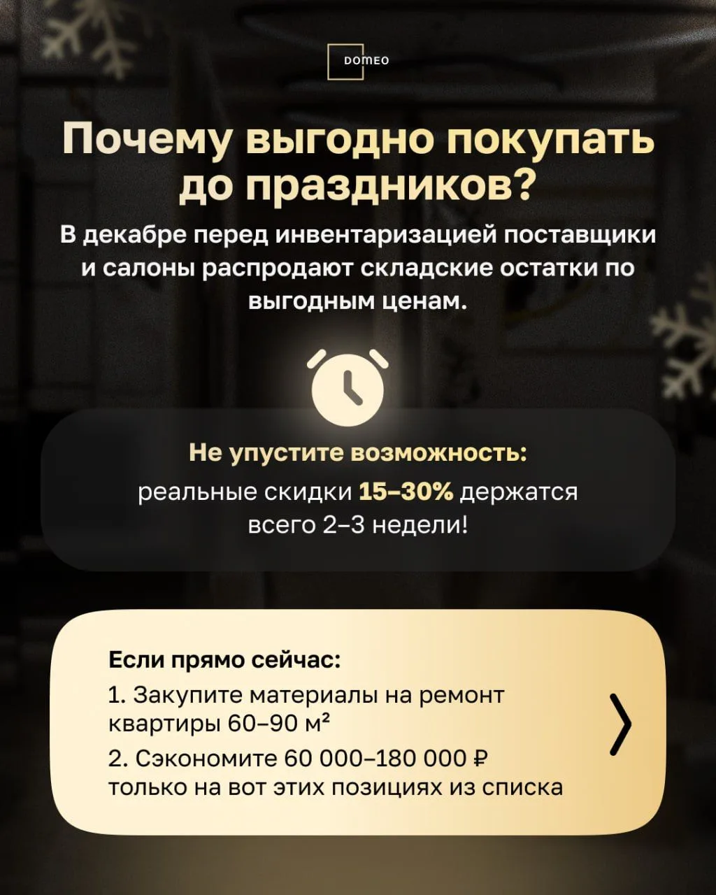 В Domeo заранее закупаем остатки у поставщиков, чтобы клиенты делали ремонт по максимально выгодным ценам — без скачков стоимости.