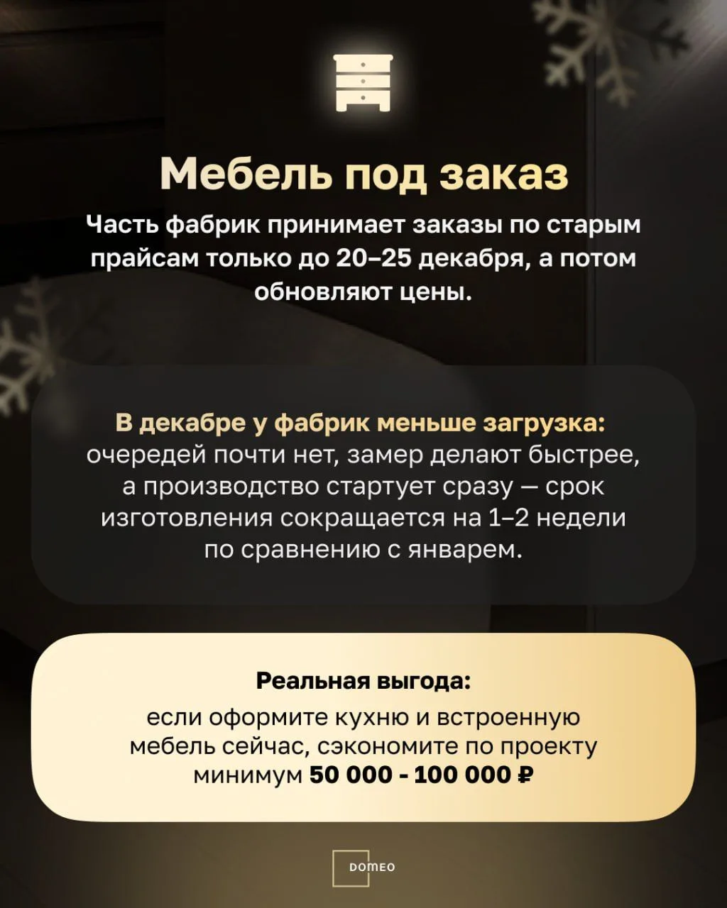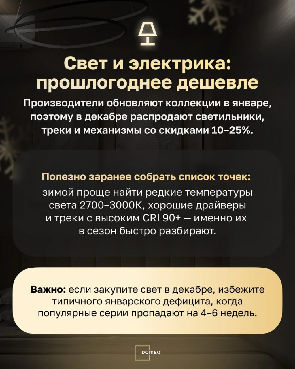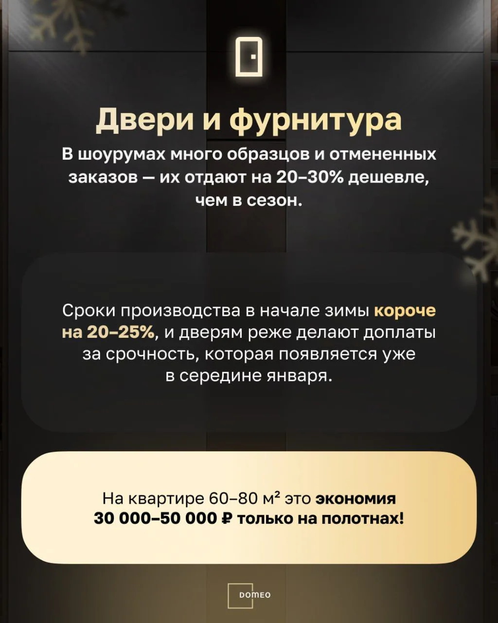 В Domeo заранее закупаем остатки у поставщиков, чтобы клиенты делали ремонт по максимально выгодным ценам — без скачков стоимости.