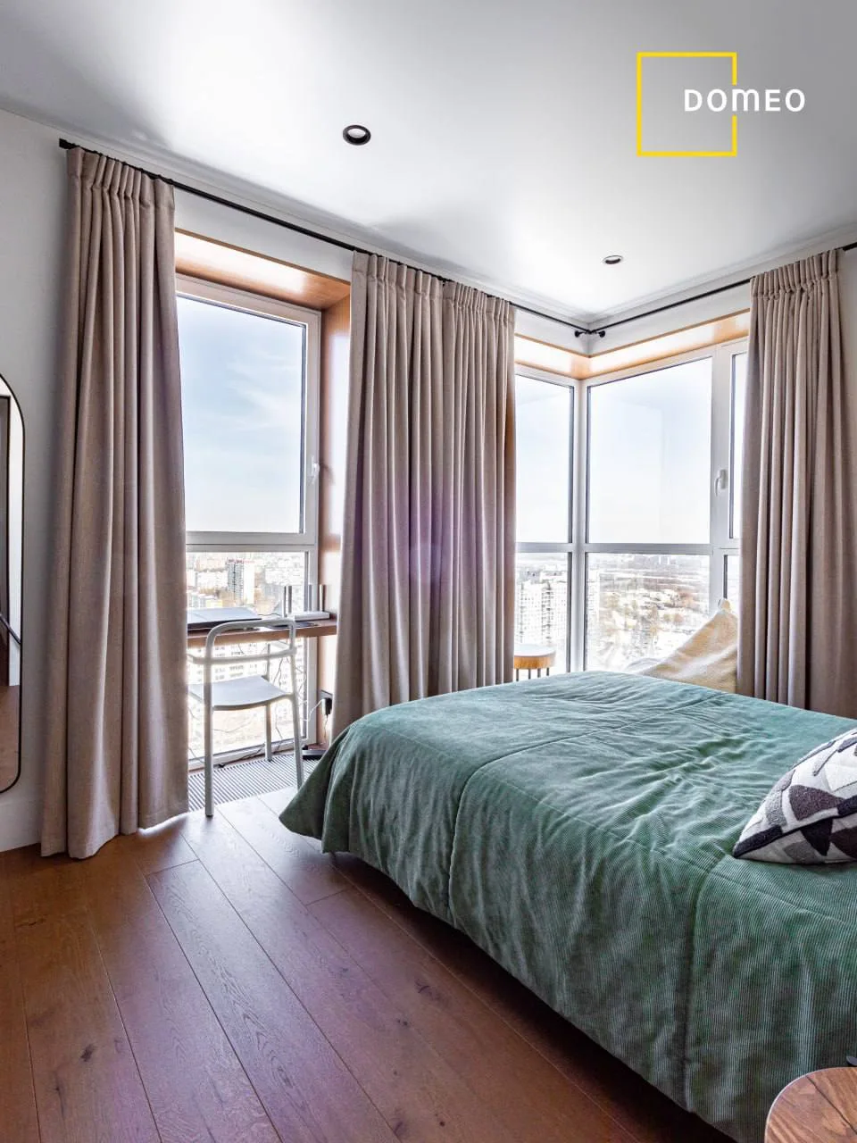 Как сэкономили? Натяжные потолки вместо гипсокартона, –20% по смете. Кварцвинил на пол: дешевле плитки и проще в уходе. Материалы со склада Domeo: –25% по смете.