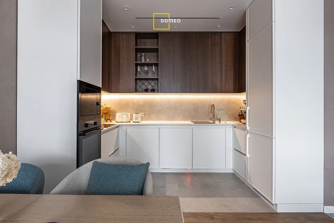Что сделали? Собрали светлый интерьер, на кухне вывели хранение до потолка, чтобы убрать визуальный шум. Рабочее место в гостиной вынесли к окну, с помощью стеклянной перегородки сохранили свет и ощущение пространства.