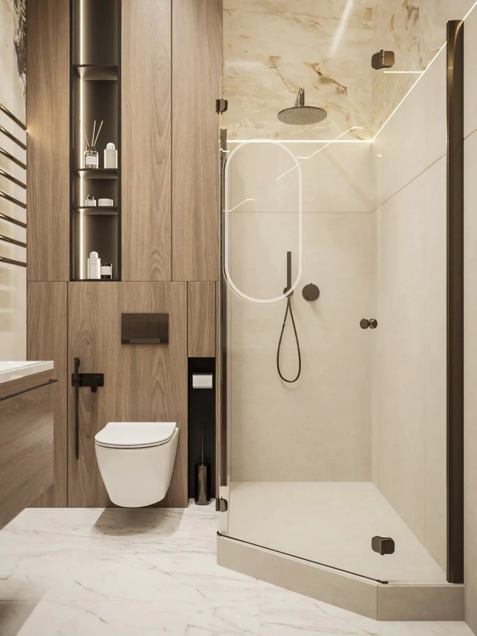 Как сэкономили? Использовали натяжные потолки вместо гипсокартона (–20% по смете) и кварцвинил вместо инженерки — теплее, тише и дешевле. Крупноформатный керамогранит и фасады из МДФ с матовой пленкой дали премиальный вид без переплаты.