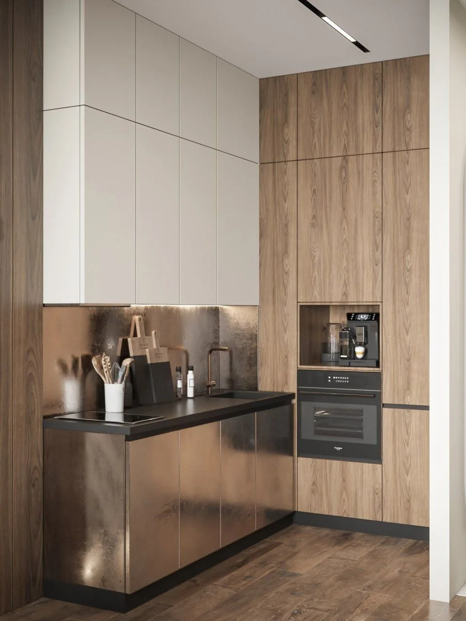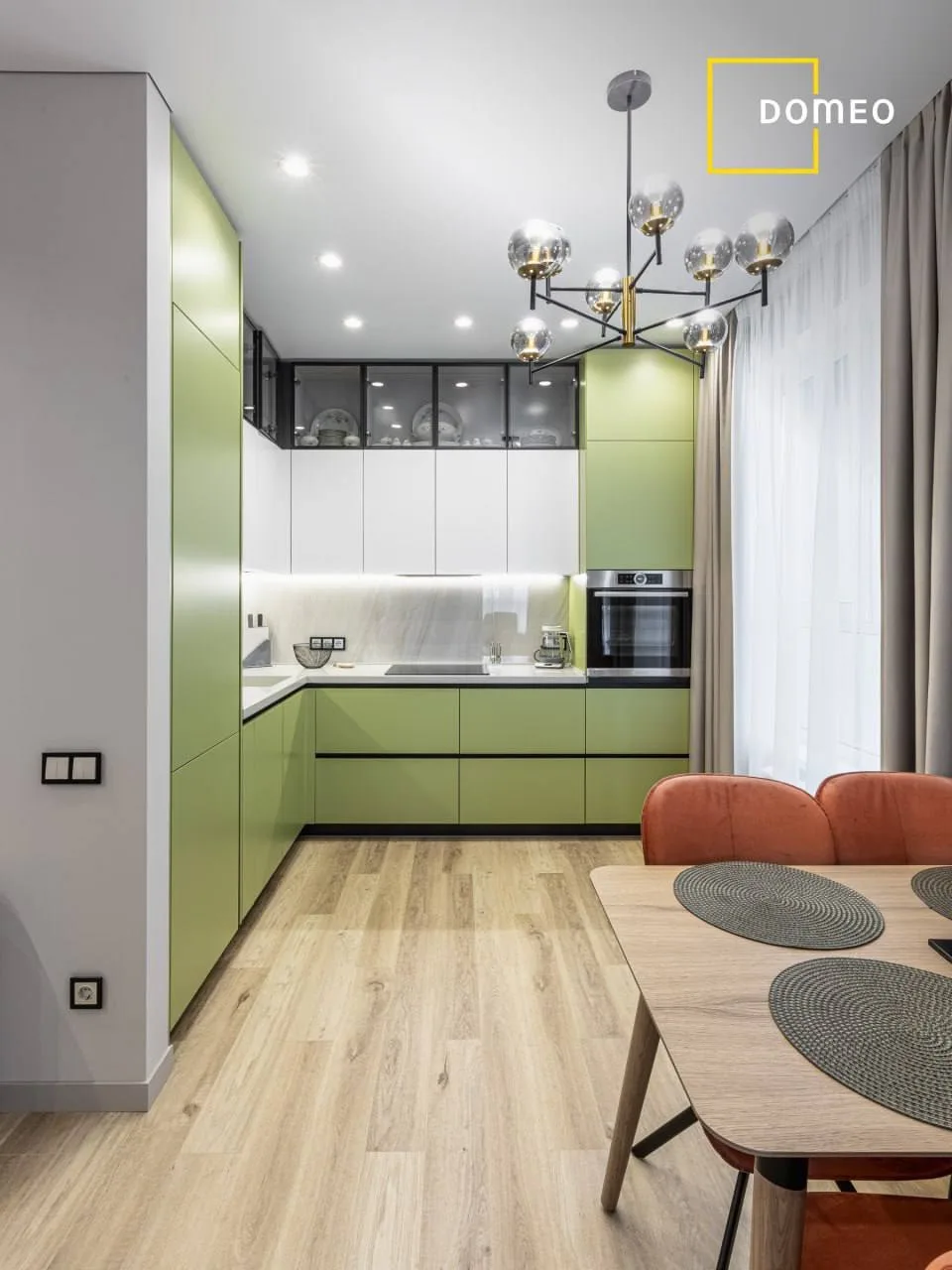 Что сделали? Продумали планировку с открытой общей зоной и приватными комнатами, а все хранение встроили, чтобы освободить место. Использовали сочетание эмали, шпона и стекла — интерьер выглядит цельным и аккуратным без переплаты.