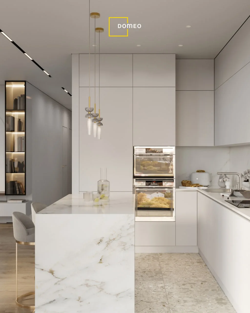 Что сделали? Убрали перегородки, объединили кухню и гостиную, добавили остров, приточную вентиляцию и встроенные световые зоны. Продумали хранение в каждом сантиметре, интегрировали гардероб в стену со входом в санузел.