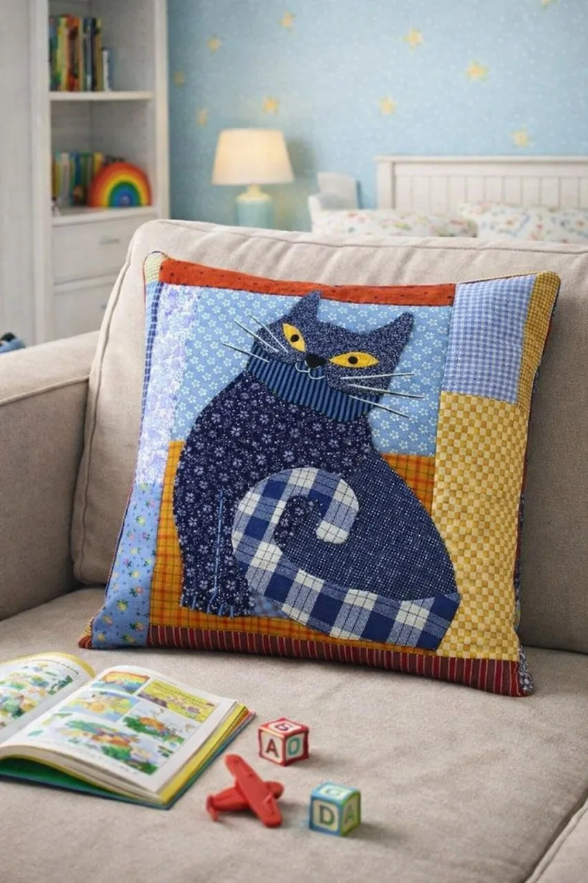 Лоскутный котик, подушка в детскую, интересная идея для шитья.