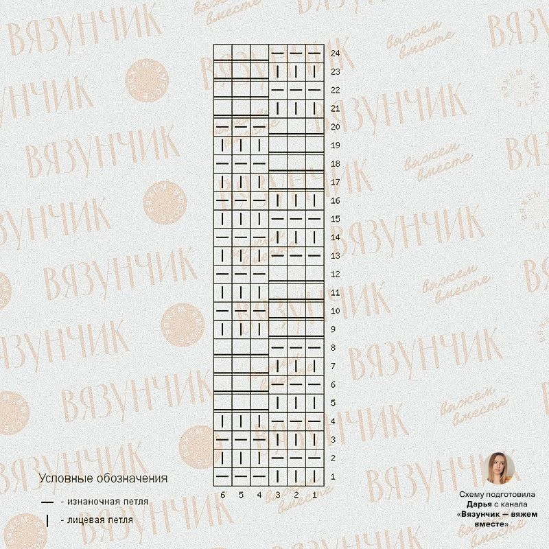Мне очень нравятся необычные варианты "плетенка". В данном случае это модель с длинными протяжками. В лицевых и изнаночных рядах протяжки идут по "лицу". Если при вязании будет сильное стягивание полотна, то можно провязывать только те петли, которые не были провязаны в лицевом ряду. Длинные полосы на схеме — протяжки.