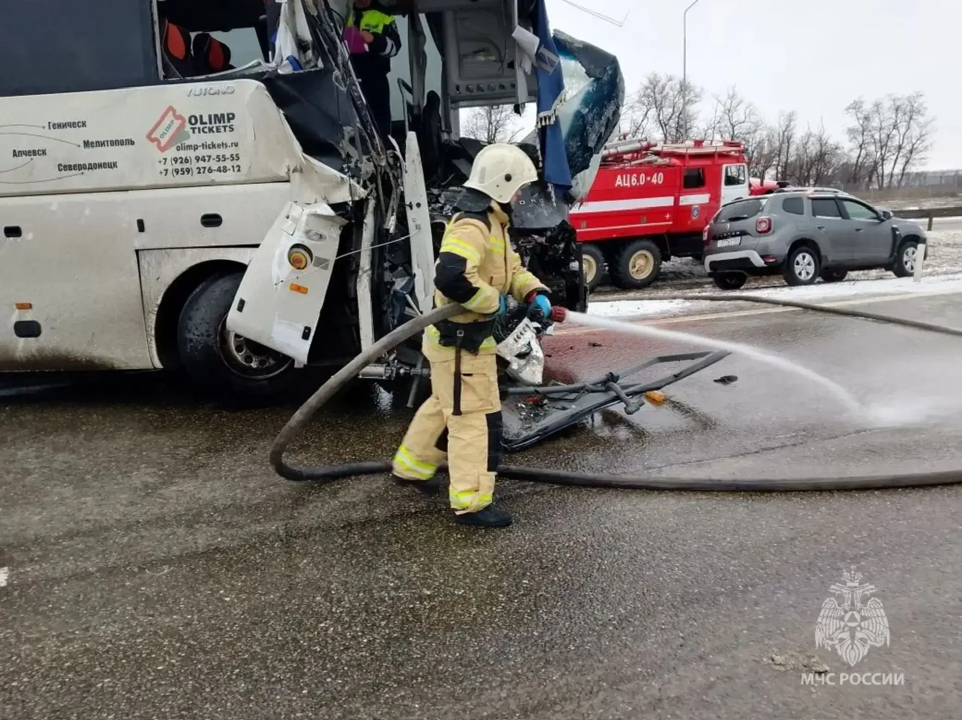 Кадры столкновения рейсового автобуса и бензовоза на М-4 «Дон» в Ростовской области обнародовало МЧС