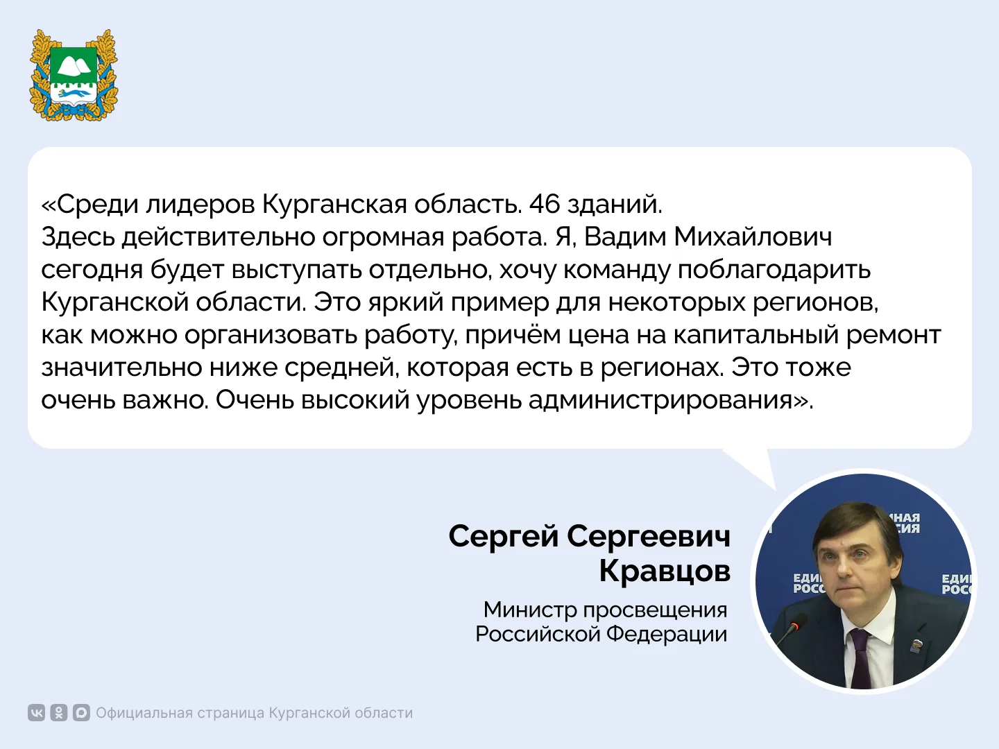 Министр просвещения Российской Федерации Сергей Кравцов назвал Курганскую область примером для регионов России по организации капитального ремонта школ, подчеркнув, что при качестве работ цена ремонтов гораздо ниже средней по стране. Такая оценка прозвучала на заседании штаба "Единой России" и Минпросвещения по капремонту и строительству школ, детских садов и учреждений СПО, которое провели секретарь Генерального совета партии Владимир Якушев и министр Сергей Кравцов.