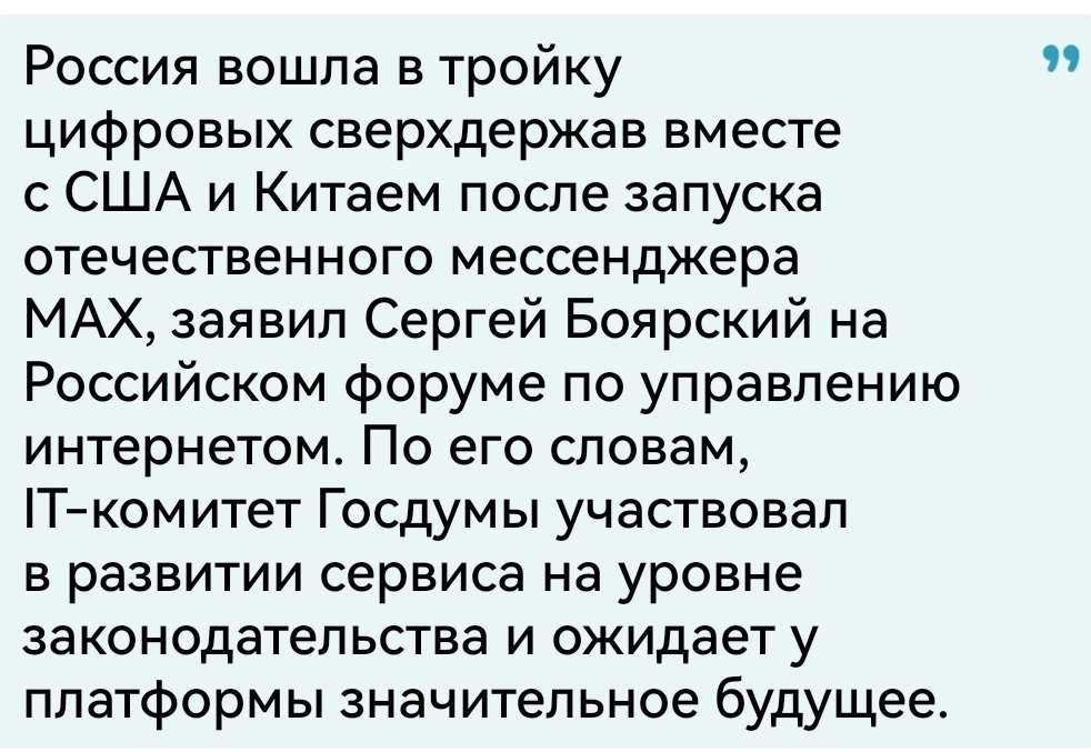 Ирония в том что в плане цифрофизации у нас есть реальные успехи. И немалые. Но как пример привели сырой мессенджер, который не совсем о цифровом суверенитете. Ибо мессенджеры есть во многих странах. Ни разу не суверенных #мысли