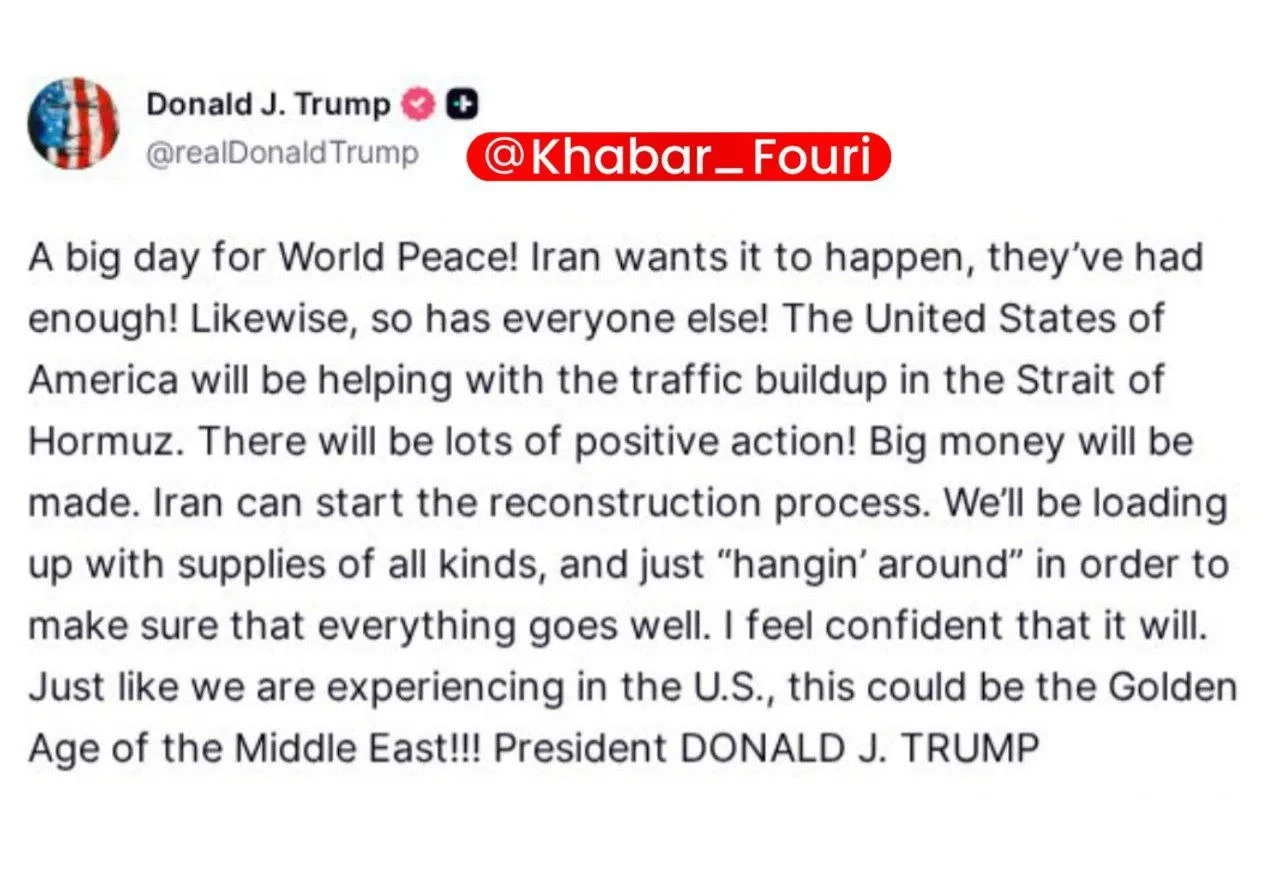 🔹Дональд Трамп в сообщении, опубликованном в социальной сети «Truth Social», назвал это событие «великим днем для мирового мира» и написал о своем намерении патрулировать окрестности Ормузского пролива: «Соединенные Штаты Америки будут помогать в управлении судоходным движением в Ормузском проливе. Впереди много позитивных действий».