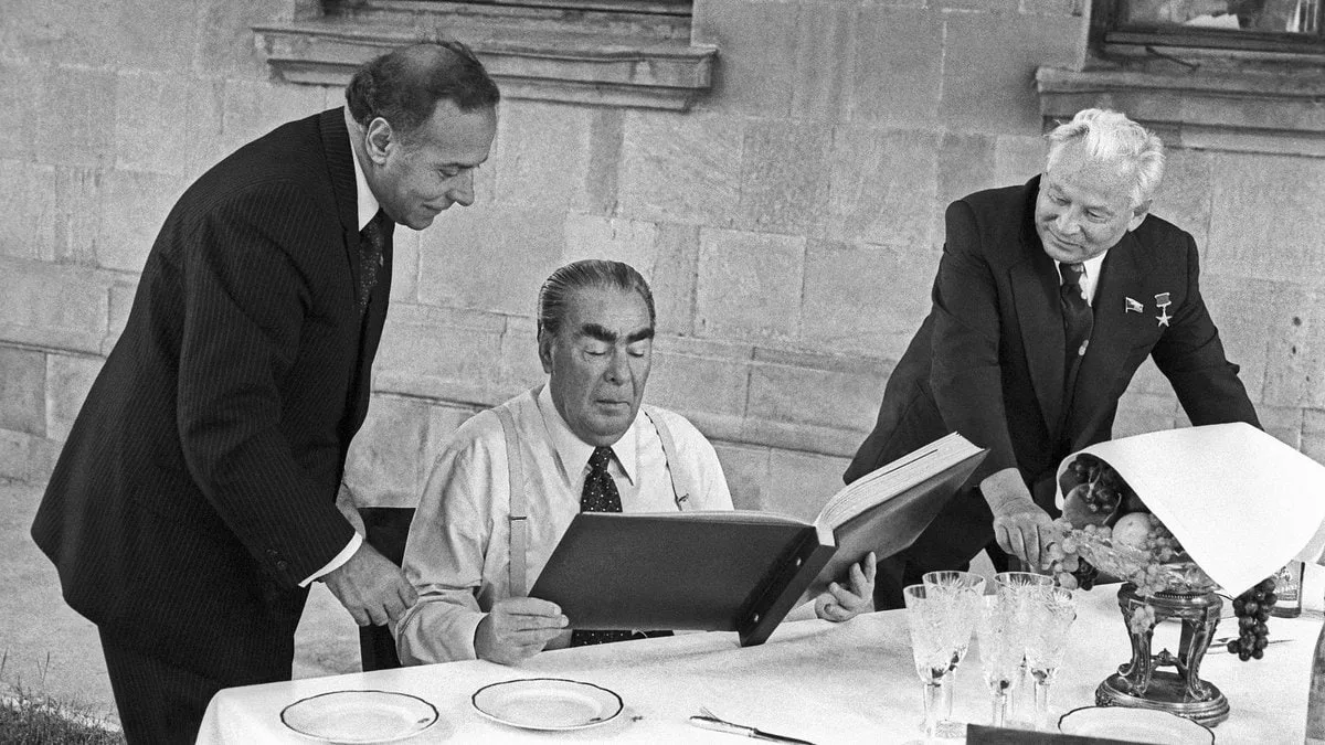 Первый секретарь ЦК Коммунистической партии Азербайджанской ССР Гейдар Алиев, генеральный секретарь ЦК КПСС Леонид Брежнев и председатель Президиума Верховного Совета СССР Константин Черненко.