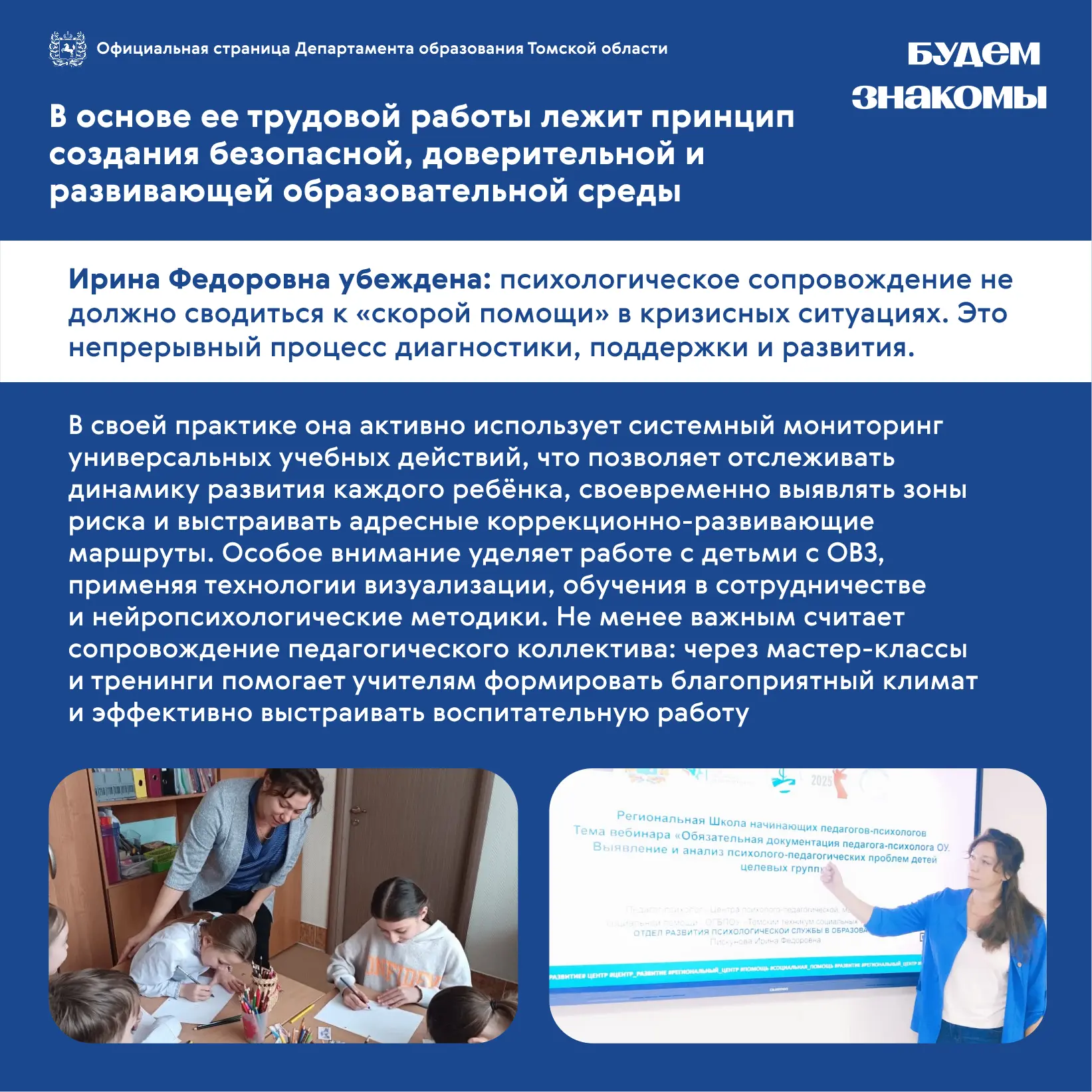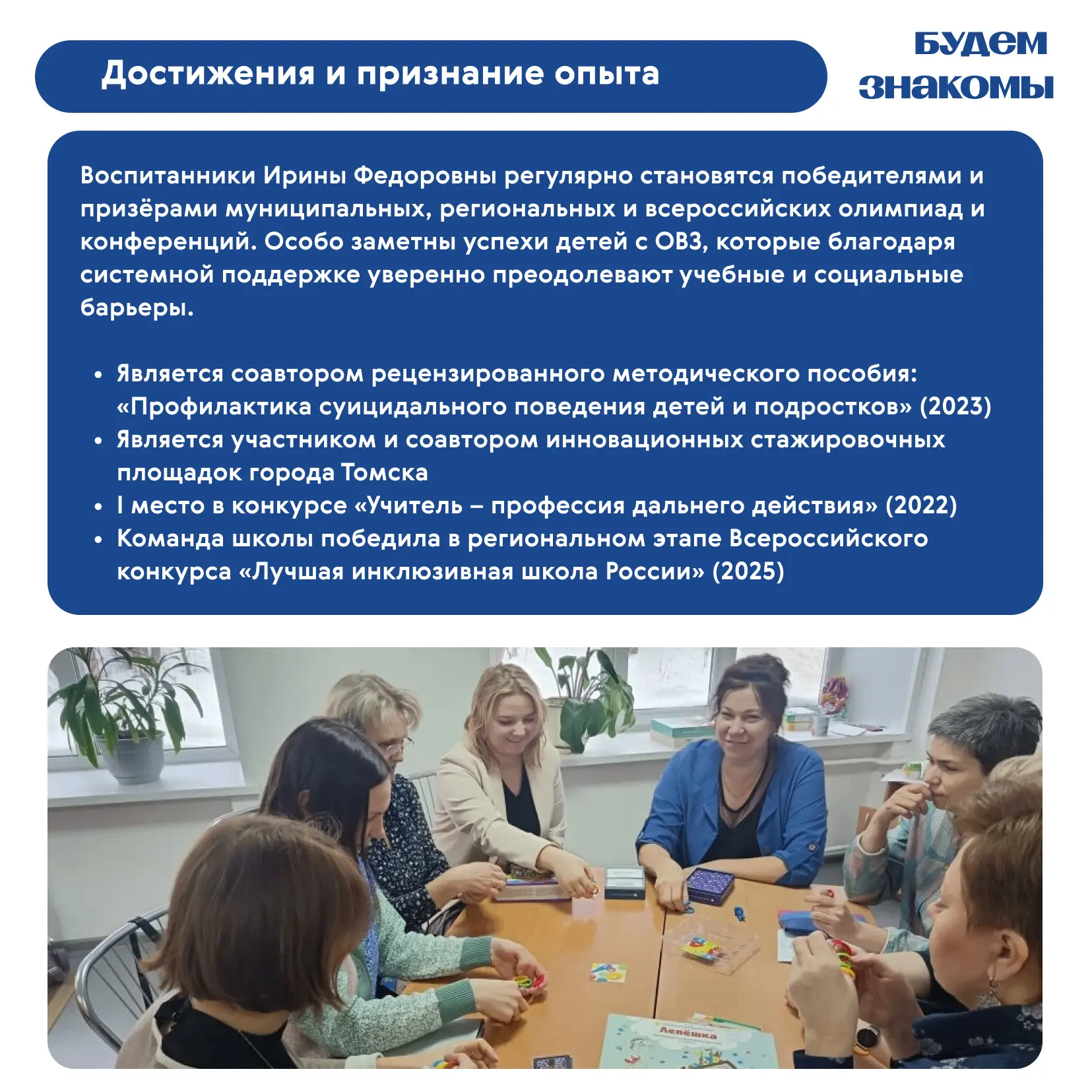 Ирина помогает школьникам справляться с трудностями, поддерживает их в важных жизненных ситуациях и создаёт условия для комфортного психологического развития. Её профессионализм, внимательное отношение к детям и умение находить подход к каждому делают её важной частью школьной команды и надёжной опорой для учеников и педагогов.