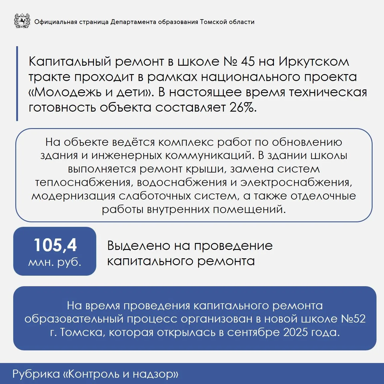 📍 На время ремонта ученики временно обучаются в школе № 52 Томска, открытой в 2025 году, где для них созданы современные и комфортные условия для занятий 📚