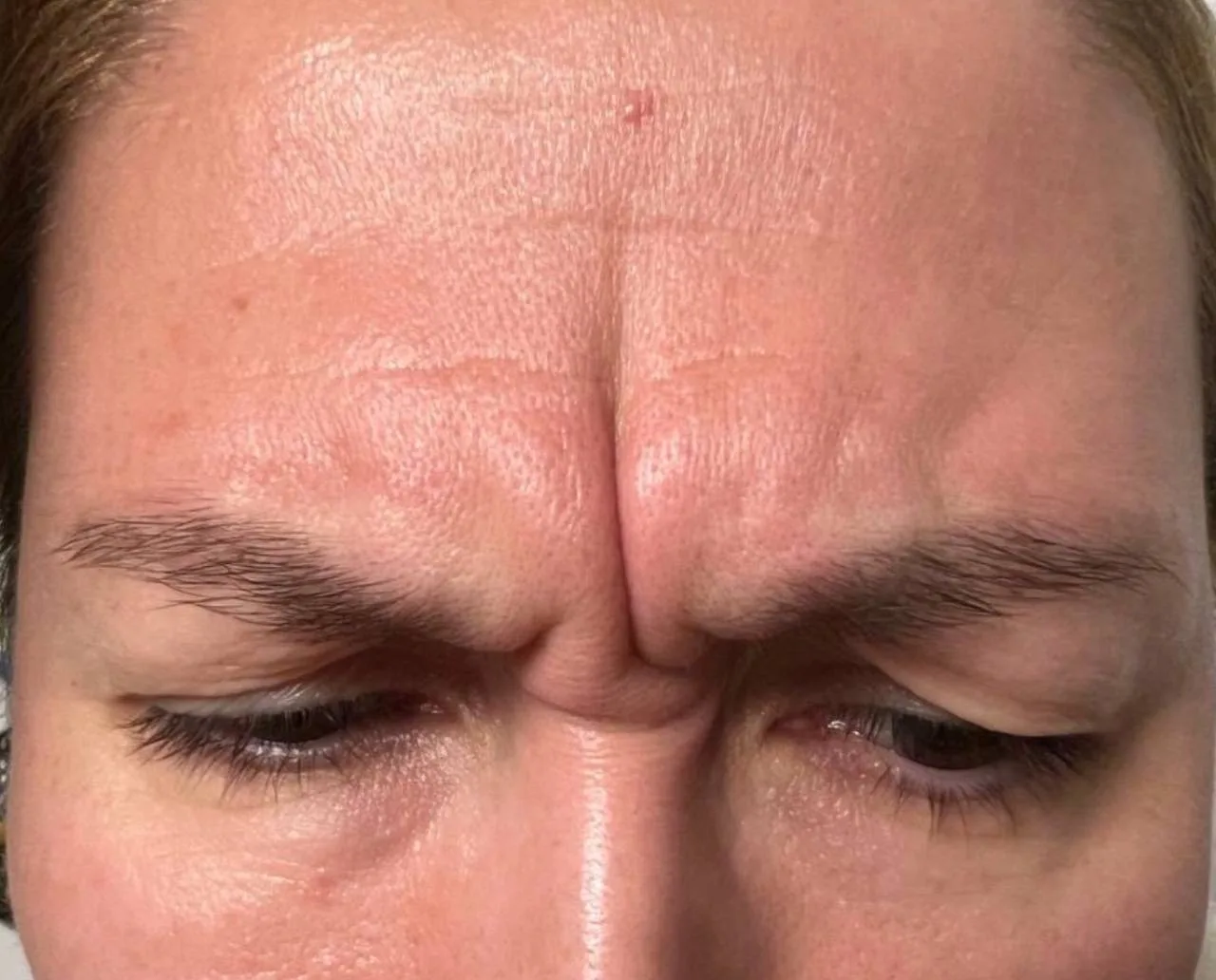 При работе с глубокой статической морщиной в зоне межбровья наша задача — предупредить пациента, что после 1 процедуры она полностью не уйдёт.