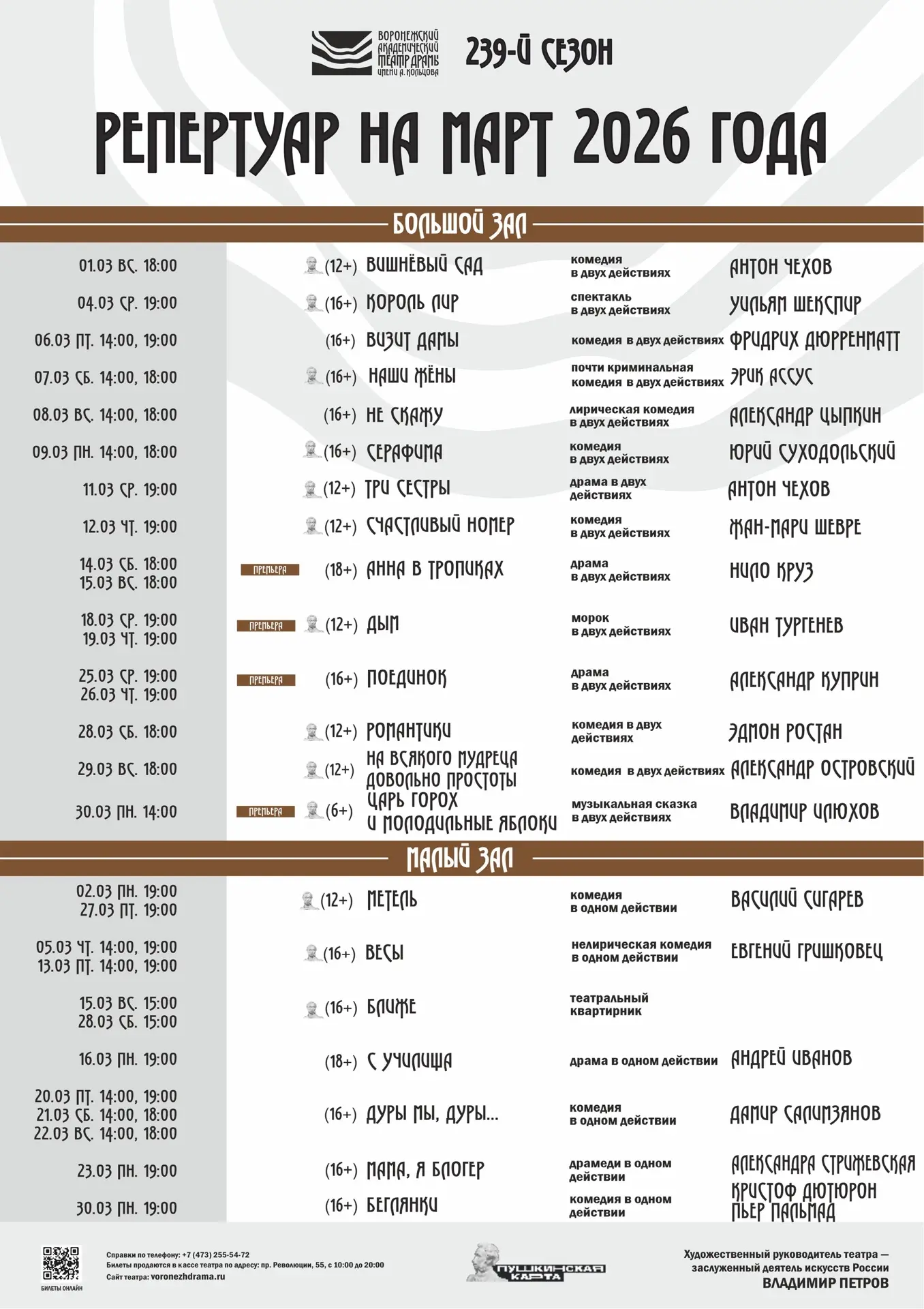 Билеты на спектакли можно приобрести в кассе театра и на сайте: voronezhdrama.ru