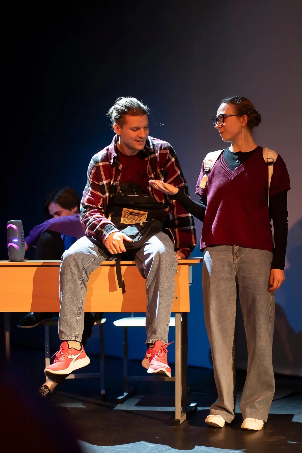 После показа сфотографироваться и пообщаться со студентами вышел артист нашего театра и исполнитель одной из главных ролей в спектакле «Романтики» Дмитрий Гусев.