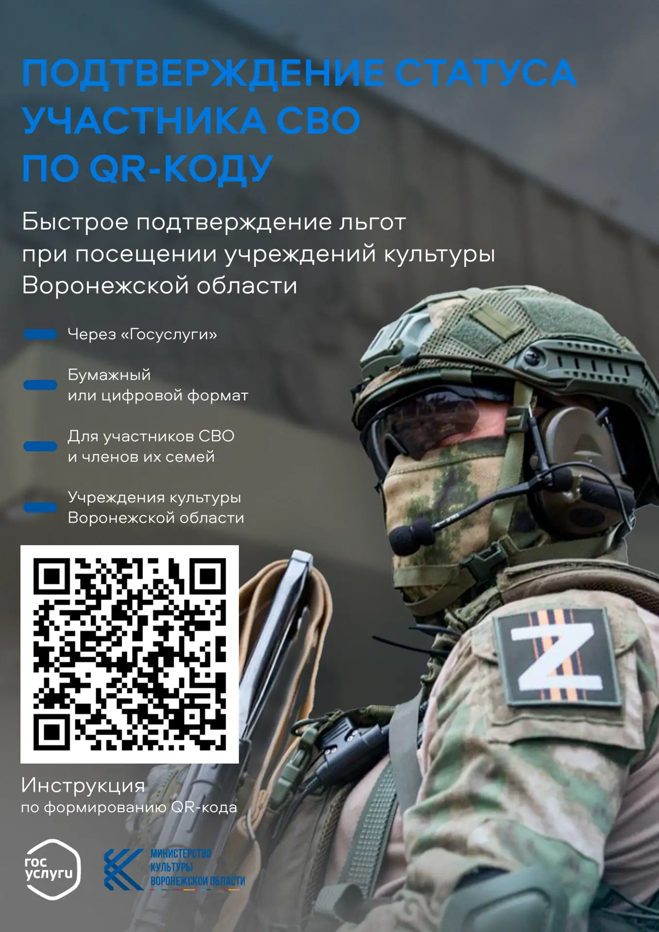 Участники специальной военной операции, а также члены их семей при посещении учреждений культуры Воронежской области могут предъявить документ об участии в СВО (справку) как на бумажном носителе, так и в цифровом формате (QR-код) или удостоверение ветерана боевых действий.