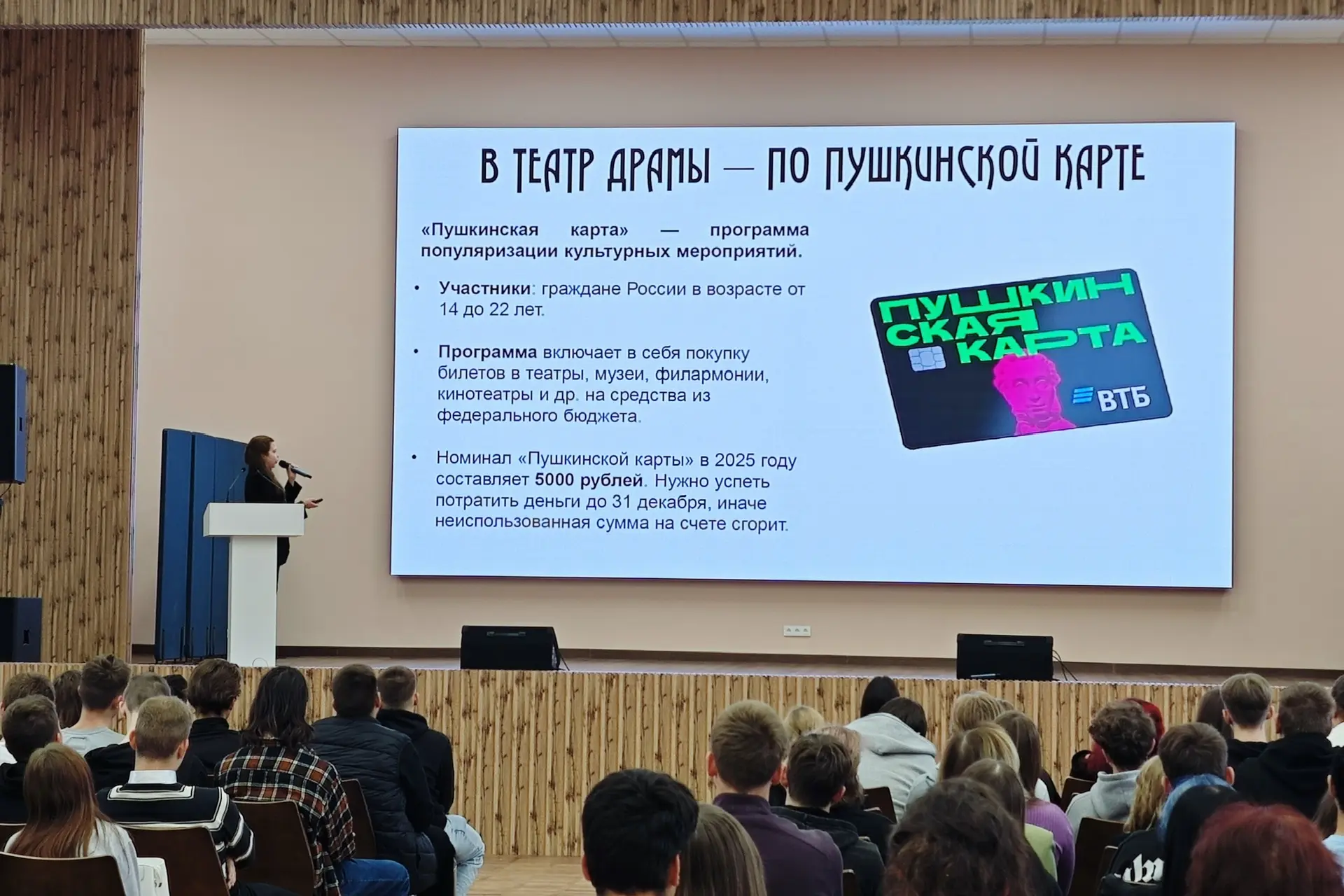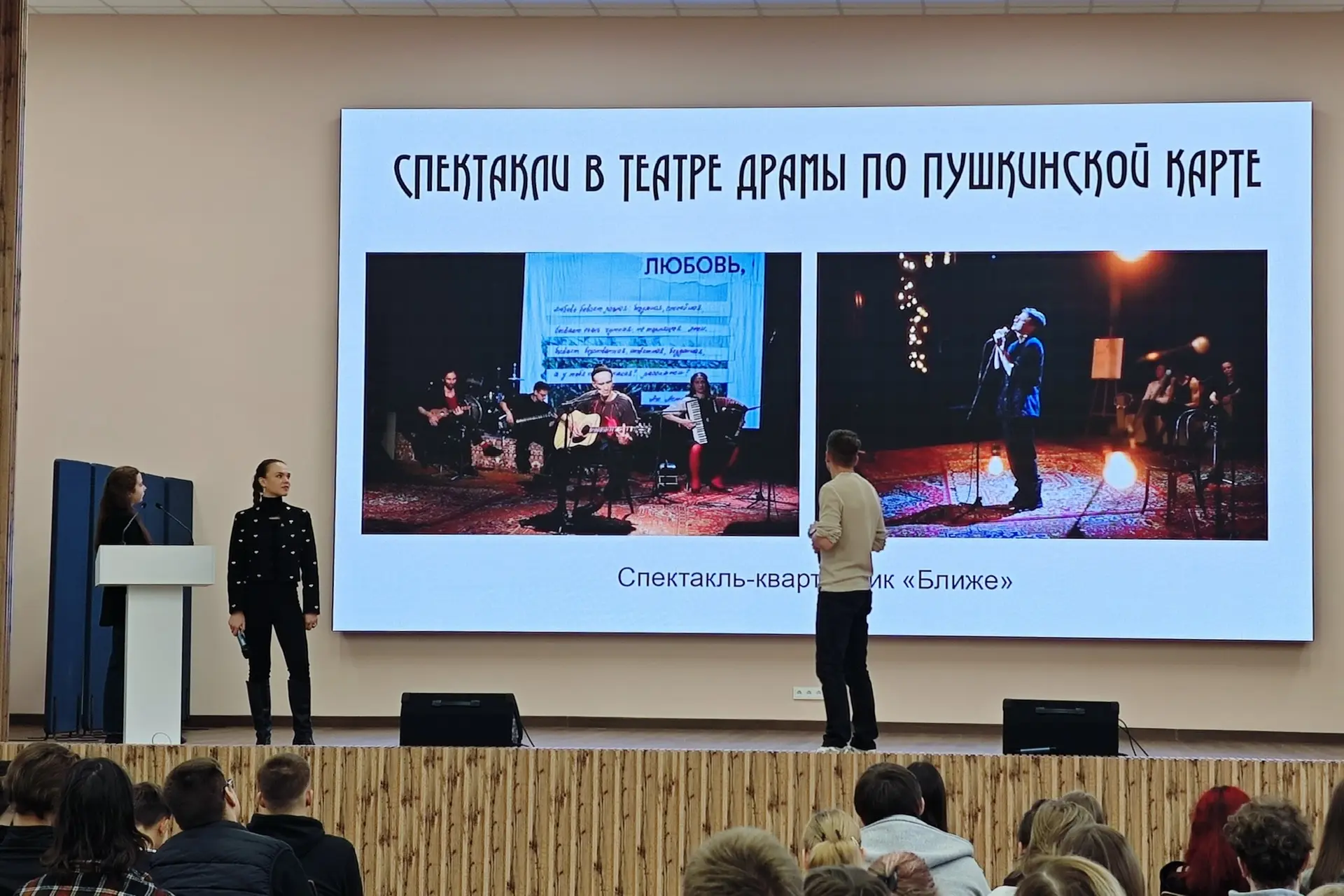 Артисты Евгений Чистяков и Милена Хорошко рассказали ребятам о спектаклях, которые можно посетить в нашем театре по Пушкинской карте.