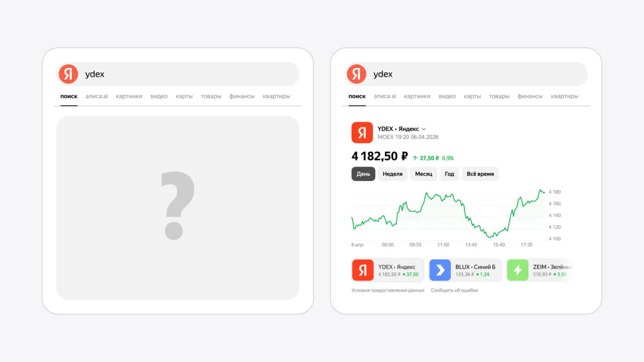 • Анализирует запрос и расставляет блоки: ссылки, видео, погода, билеты
