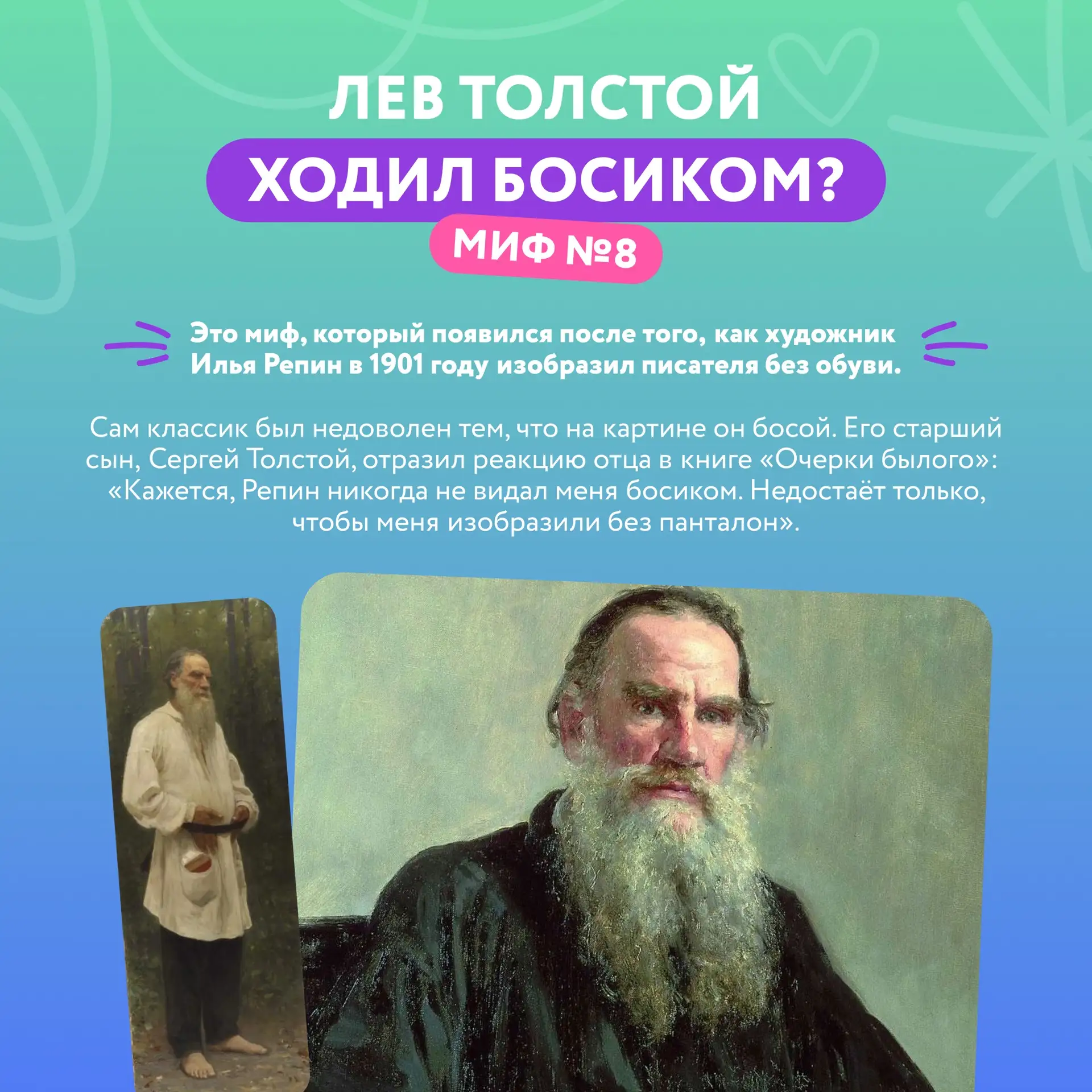 В Международный день культуры поговорим о великих: правда ли Толстой ходил босиком, был ли у Дантеса бронежилет на дуэли, писал ли Айвазовский море по памяти?