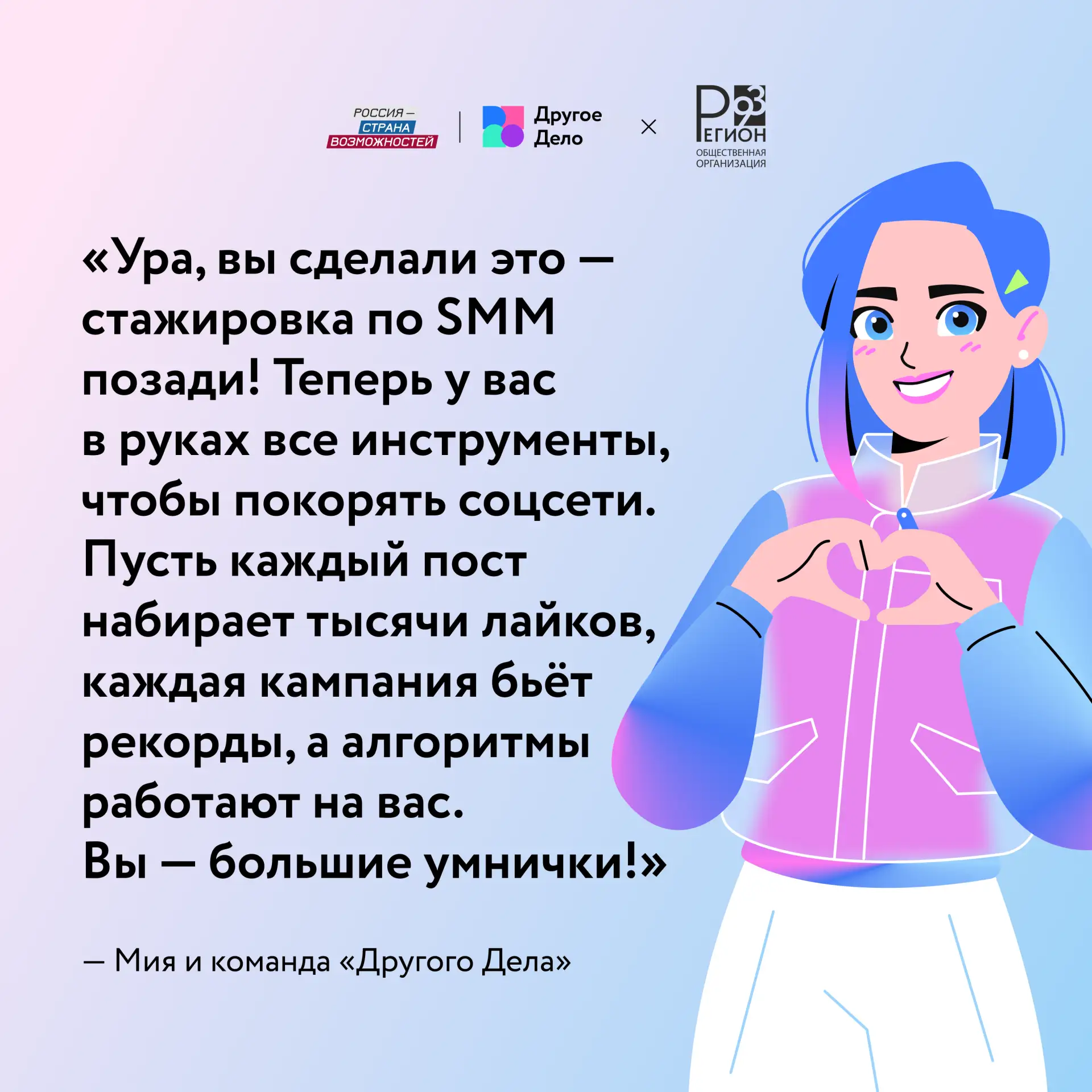 Актив Другого Дела — это не просто быть в проекте. Это когда твои идеи превращаются в спецпроекты, твои посты набирают тысячи просмотров, а выступления в школах и вузах реально вдохновляют других.