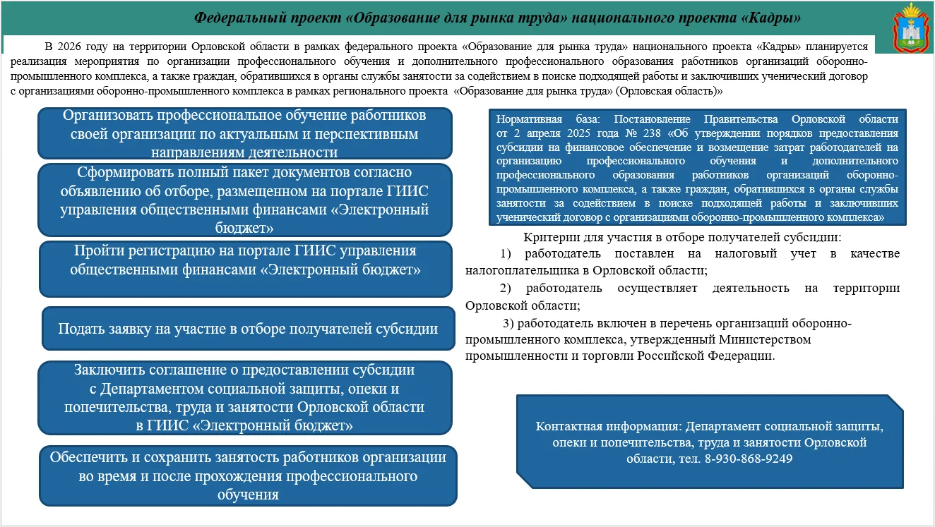 📞 Узнать подробности можно по телефону Кадрового центра Орловской области: +7 (4862) 59-96-26.