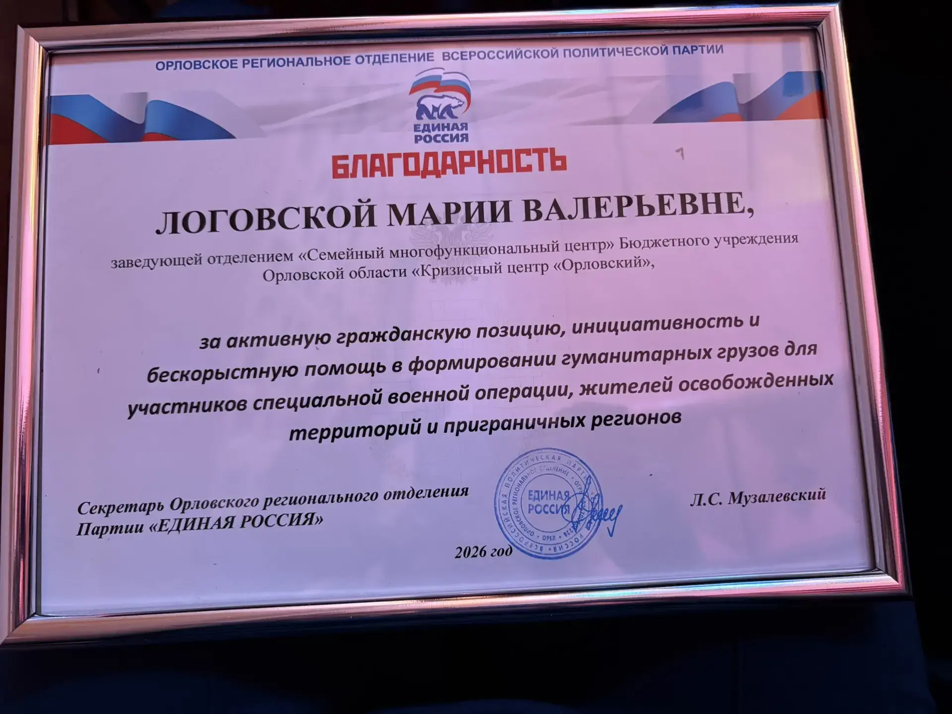 👏 Семейный МФЦ города Орла наградили за активную гражданскую позицию, инициативность и бескорыстную помощь в формировании гуманитарных грузов для участников специальной военной операции, жителей освобожденных территорий и приграничных регионов