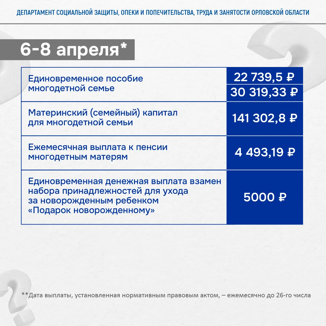 Ключевые итоги участия Орловщины в его реализации: за прошлый год почти 790 многодетных семей воспользовались средствами областного материнского капитала на сумму около 141 тысячи рублей. Более 8 400 многодетных семей получили ежемесячное пособие.