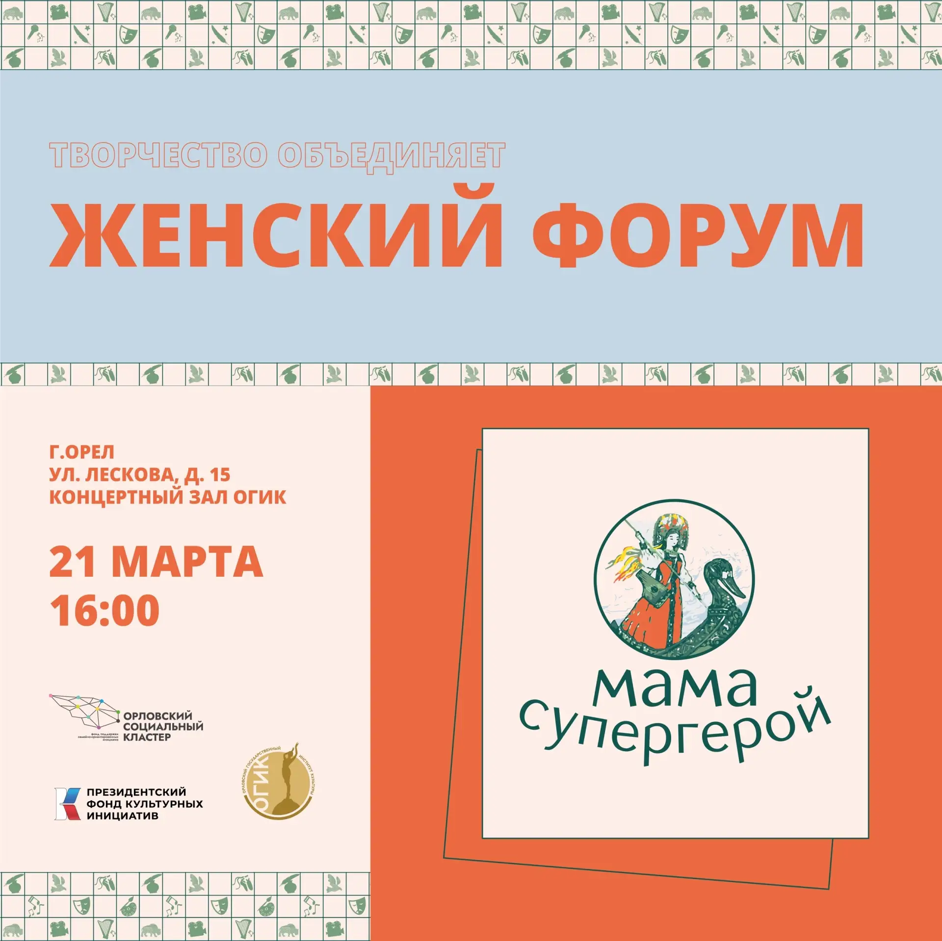 🦸♀️ Орловский социальный кластер приглашает всех желающих на Женский форум «Творчество объединяет» в рамках проекта «Мама-супергерой»