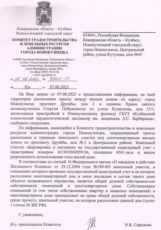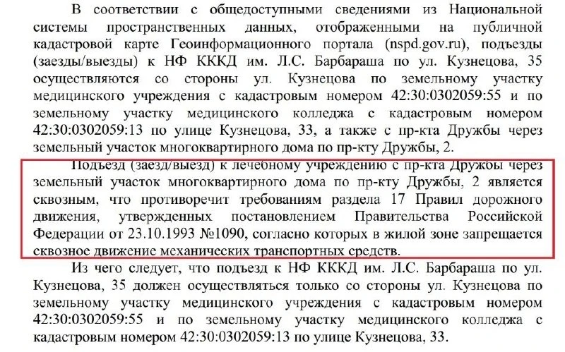 По мнению администрации Новокузнецка, подъезд к НФ КККД им. Л.С. Барбараша должен осуществляться со стороны улицы Кузнецова по земельному участку, принадлежащему медицинскому учреждению, а также по земельному участку медицинского колледжа, расположенного по ул. Кузнецова, 33.